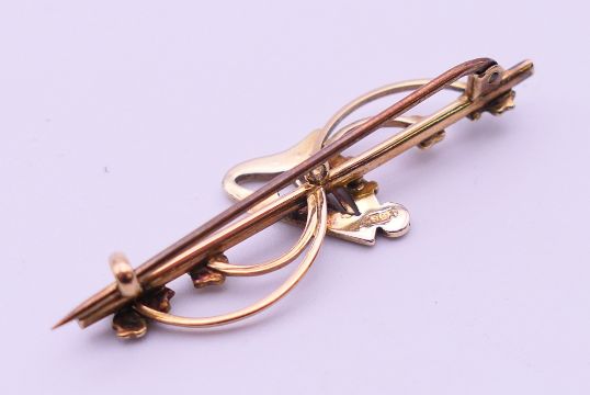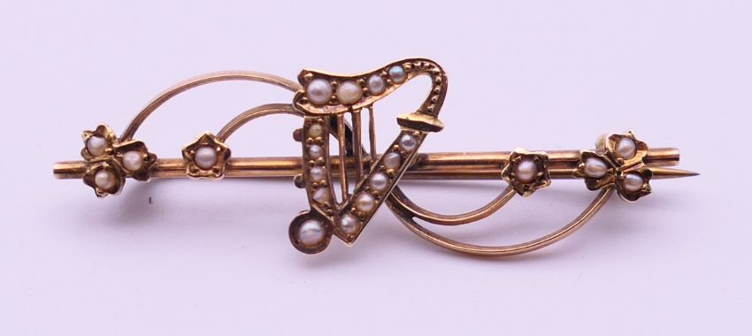 An Edwardian 9 ct gold and seed pearl harp bar brooch. 5 cm long. 2.9 grammes total weight.