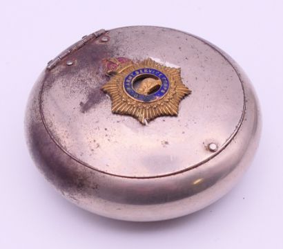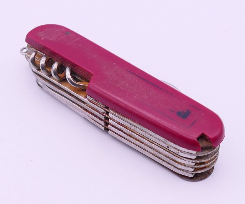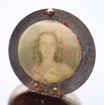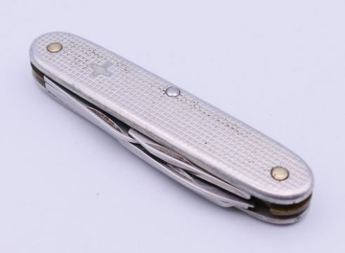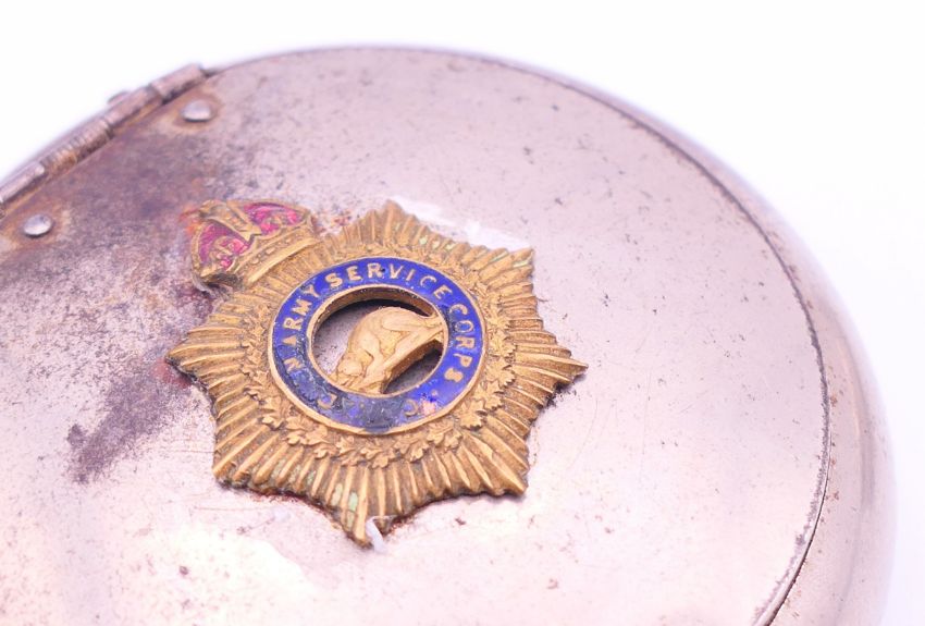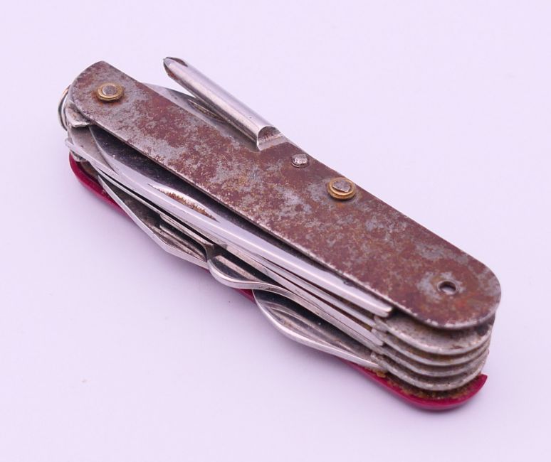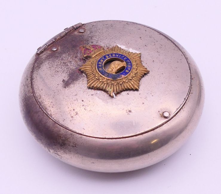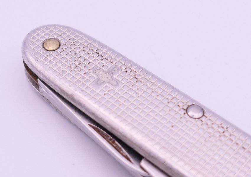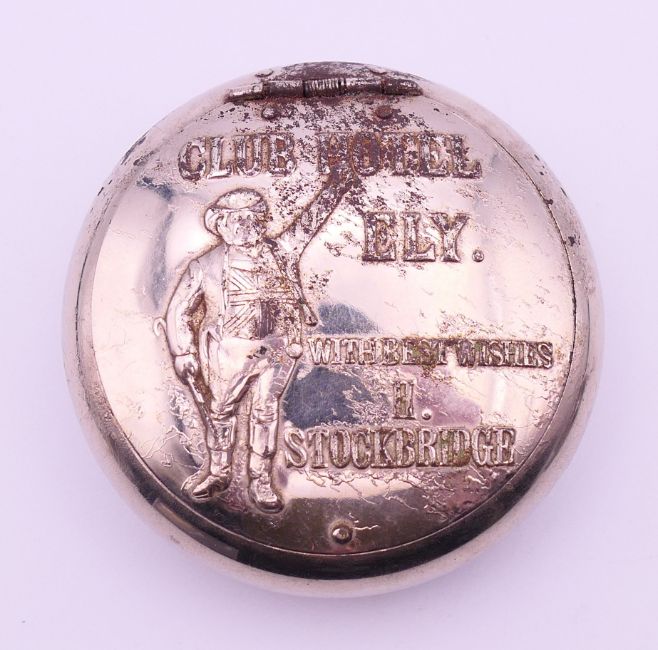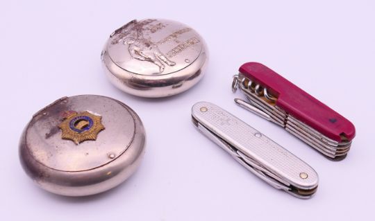 Two tobacco tins, one with a Canadian Army Service Corps badge and sweetheart photograph inside the lid, the other inscribed 'Club Hotel Ely with best wishes H Stockbridge, together with two Swiss Army penknives.