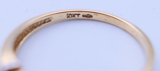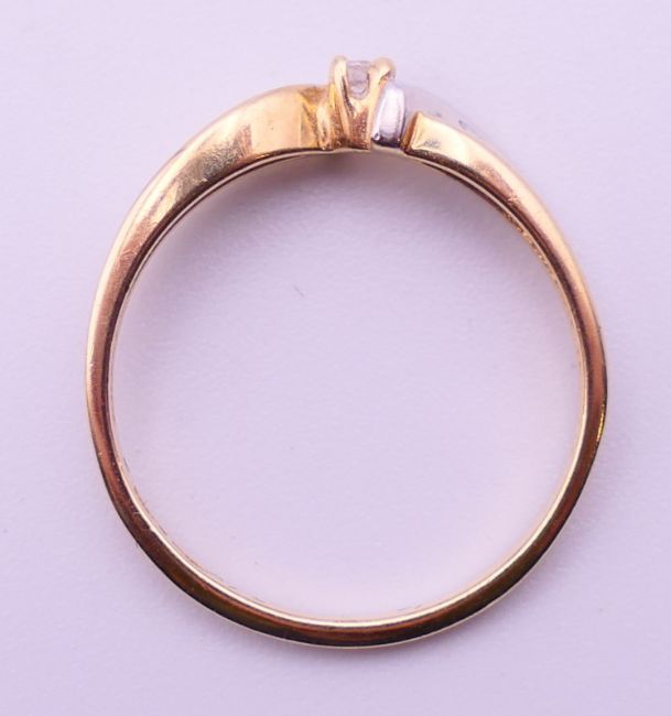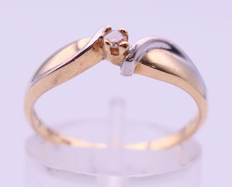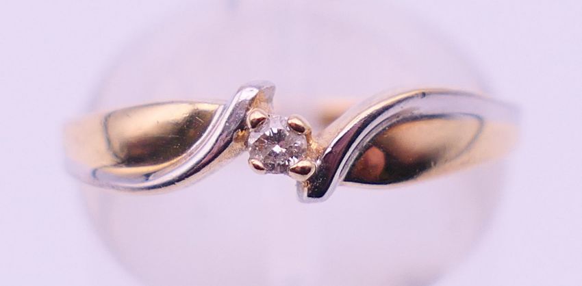 A 10 ct bi-colour gold diamond solitaire ring. Ring size N. 1.6 grammes total weight.