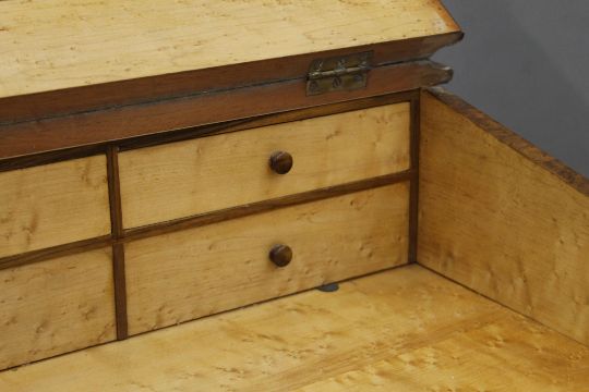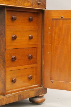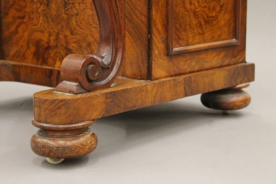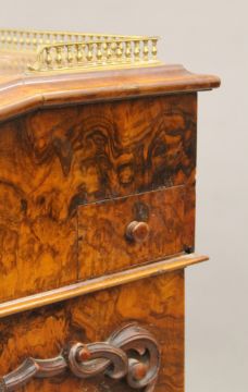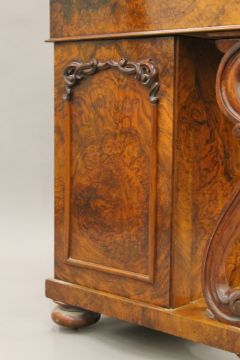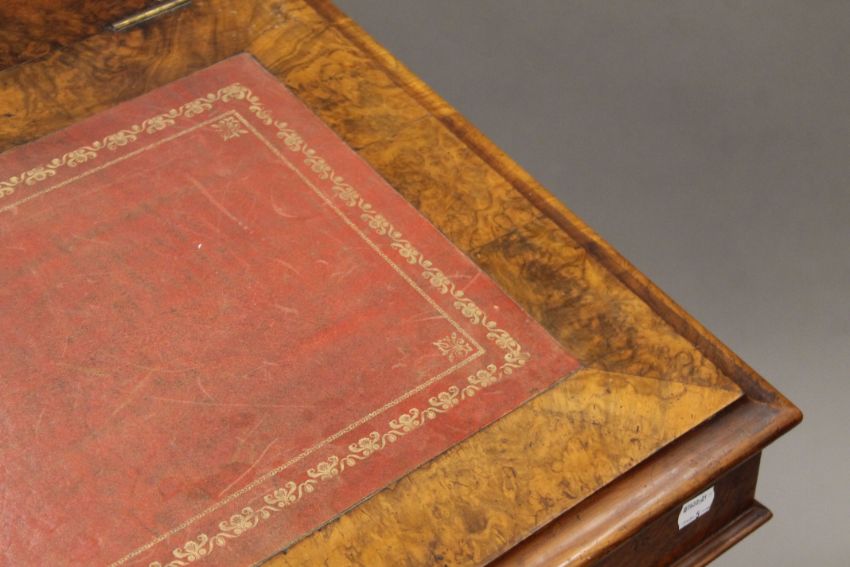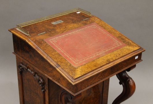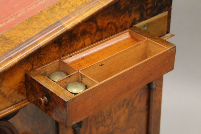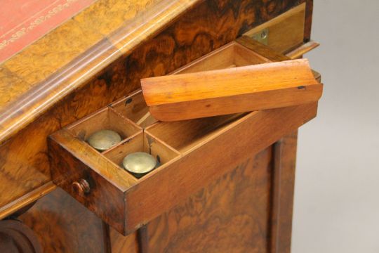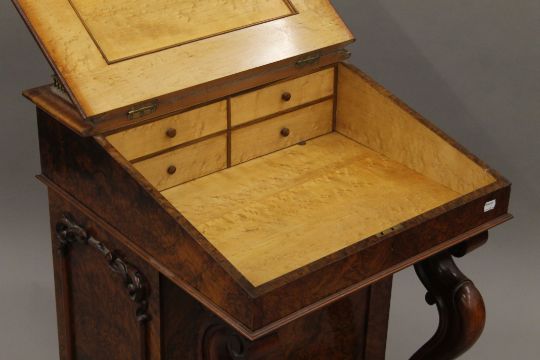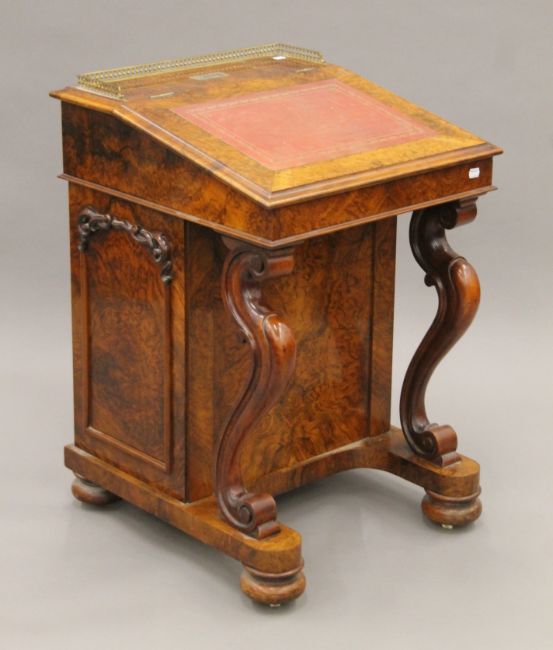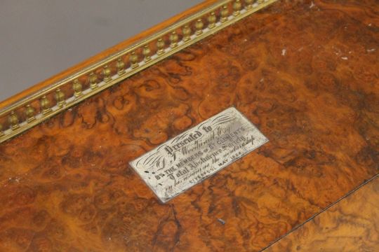 A Victorian burr walnut Davenport, the top with inset presentation inscription. 55 cm wide.