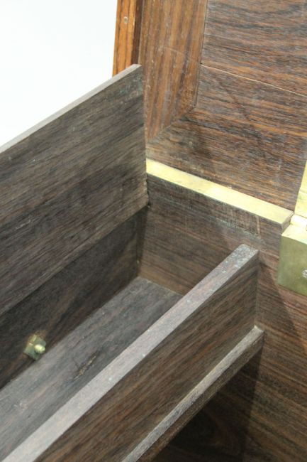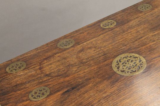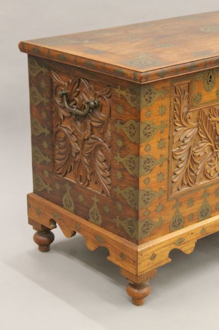 An Eastern brass inlaid carved hardwood trunk. 111 cm long.
