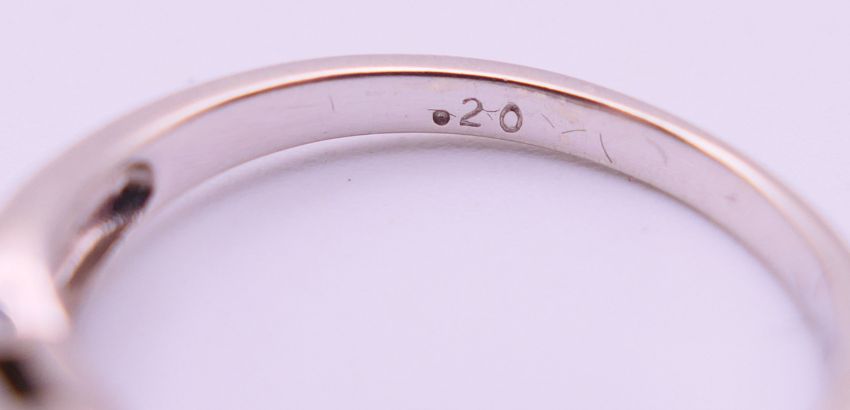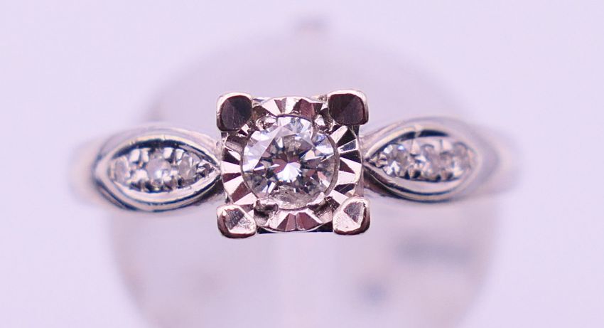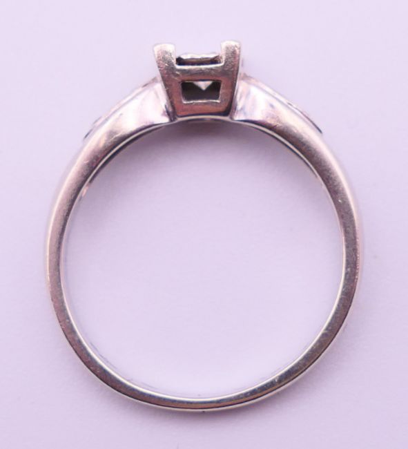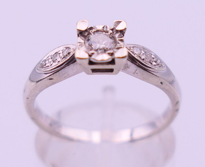 A 9 ct white gold and 0.20 carat diamond ring. Ring size N/O. 2.9 grammes total weight.
