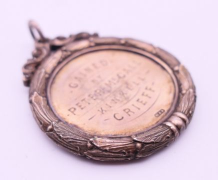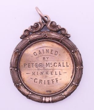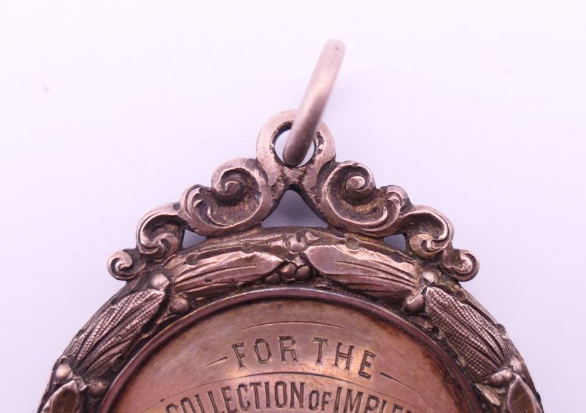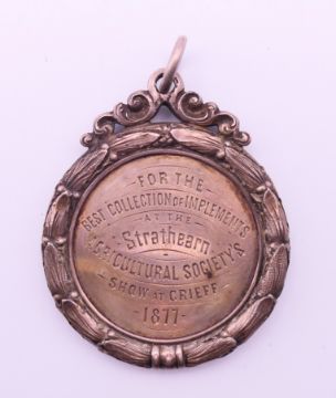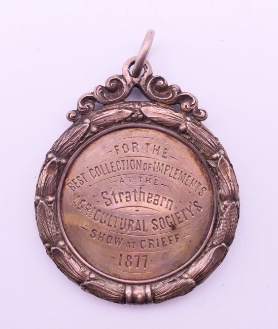 An 1877 silver medallion for the best collection of implements at the Strathearn agricultural society's show at Crieff 1877. 5 cm diameter.