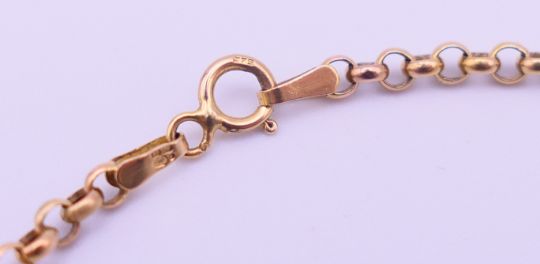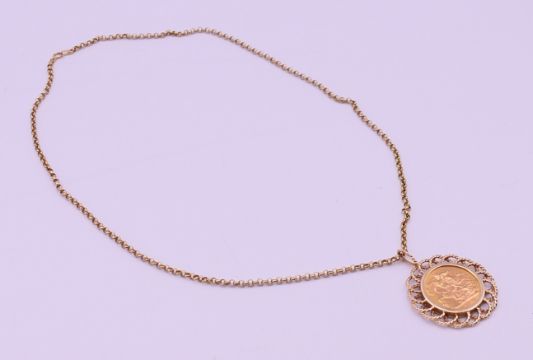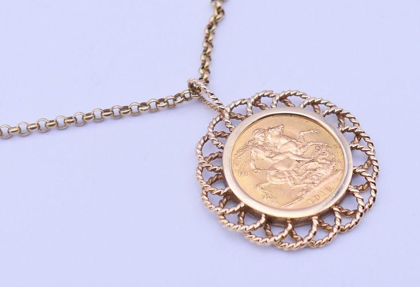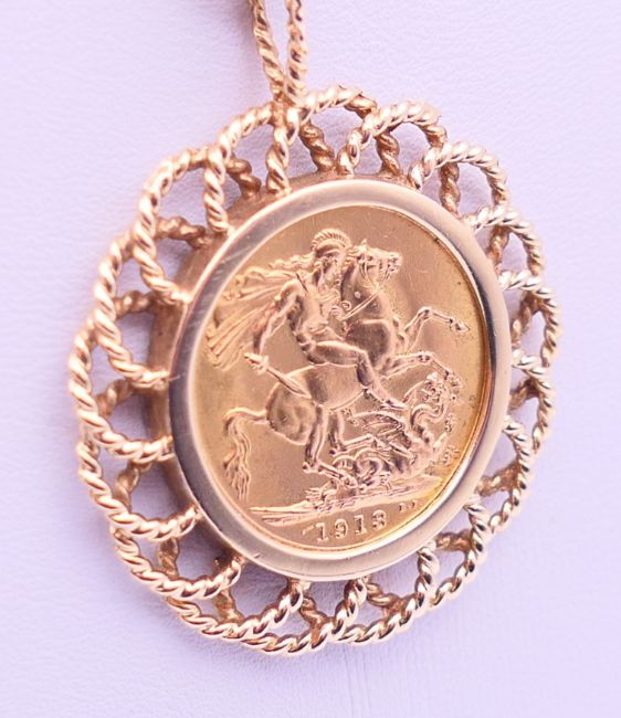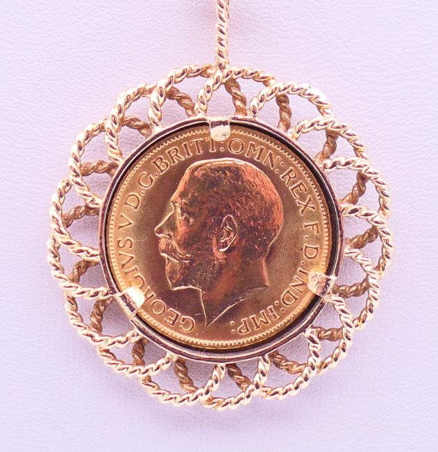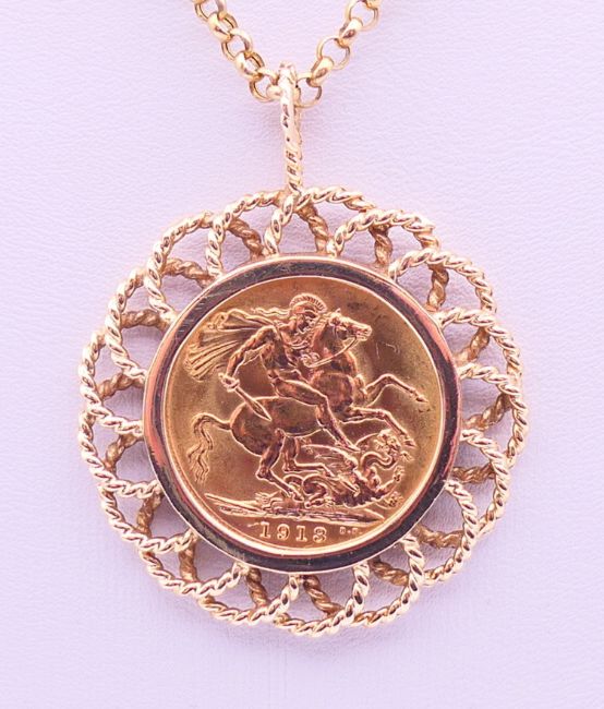 A 1913 sovereign in a 9 ct gold pendant mount on a 9 ct gold chain. Sovereign mount 3.5 cm diameter, chain 50 cm long. 16.2 grammes total weight.