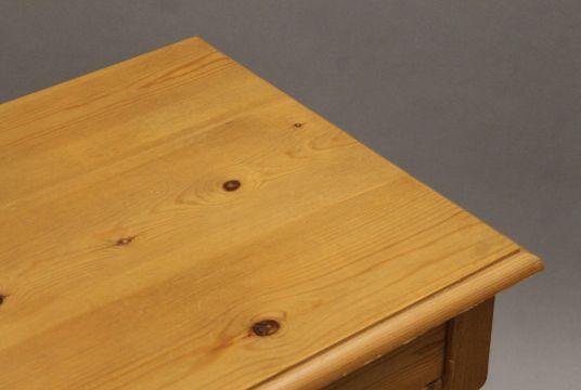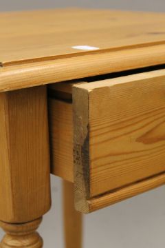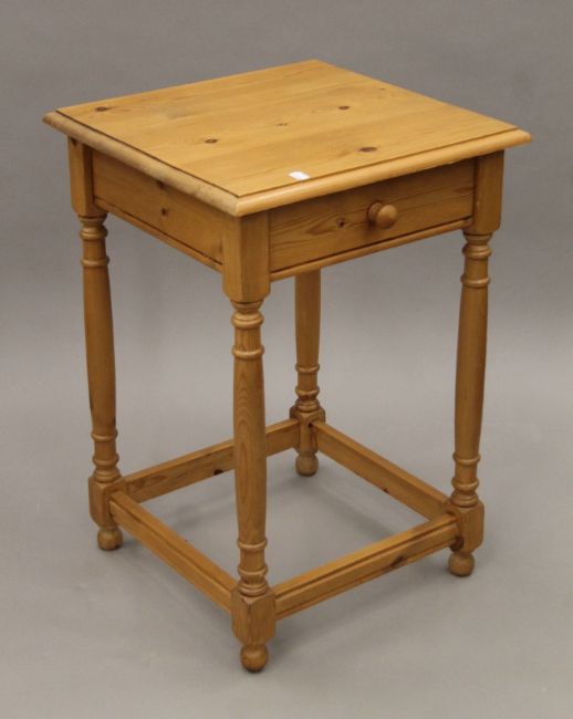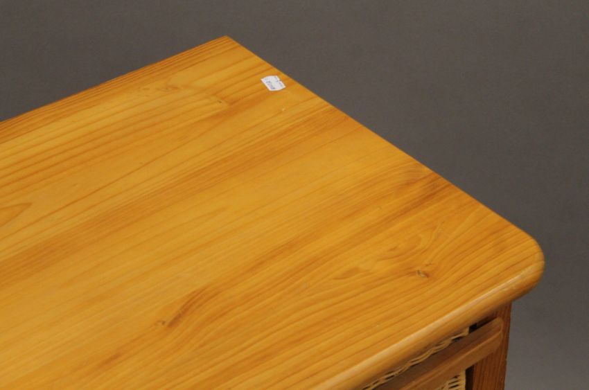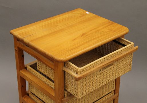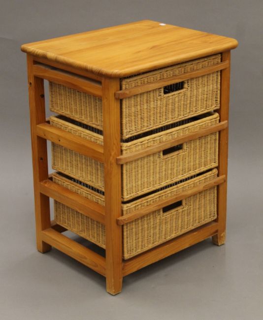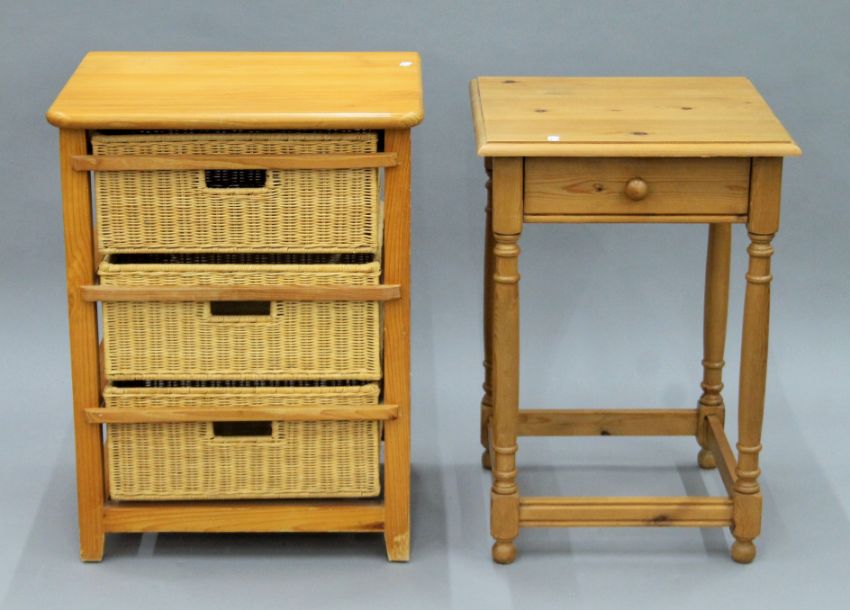 A small modern pine unit with three basket drawers and a modern pine single-drawer side table. The former 56 cm wide.