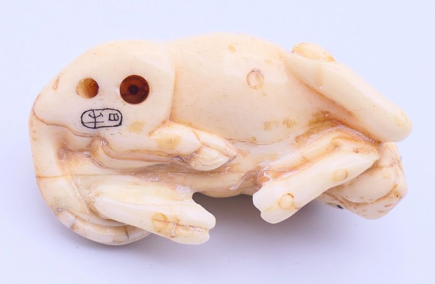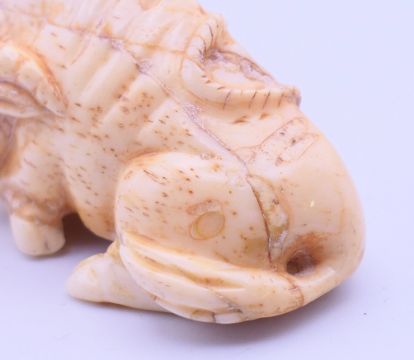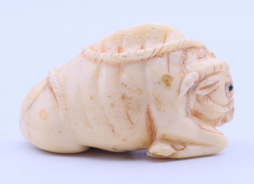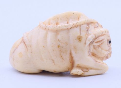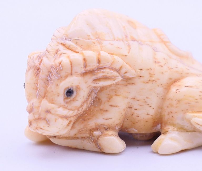 A bone netsuke formed as a buffalo. 5 cm long.
