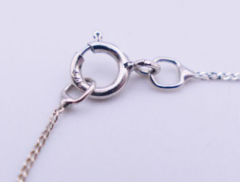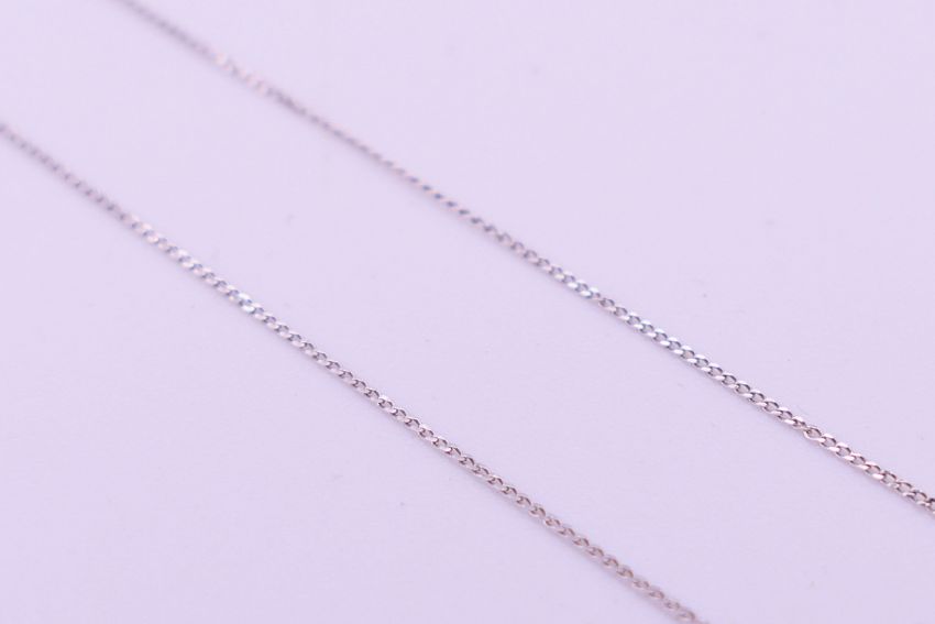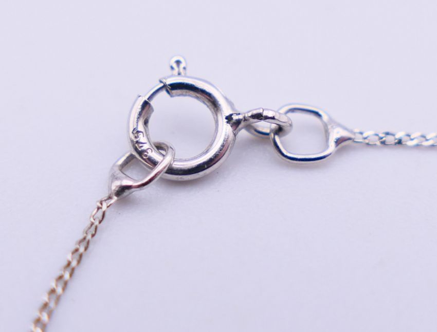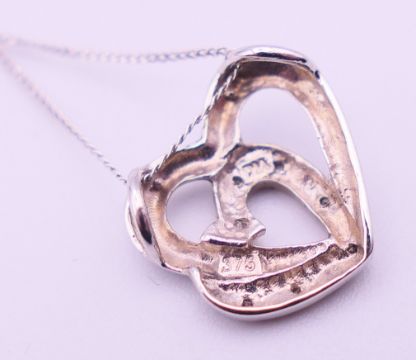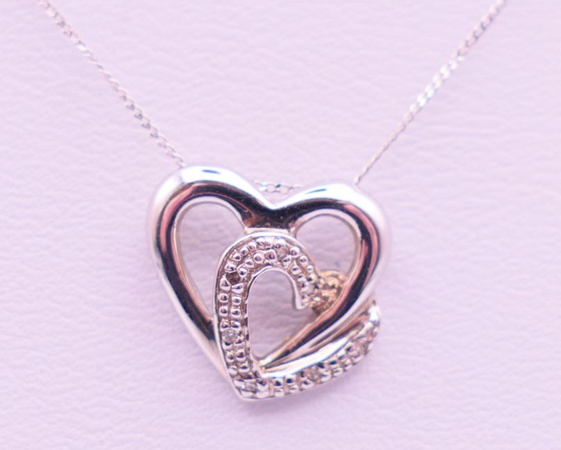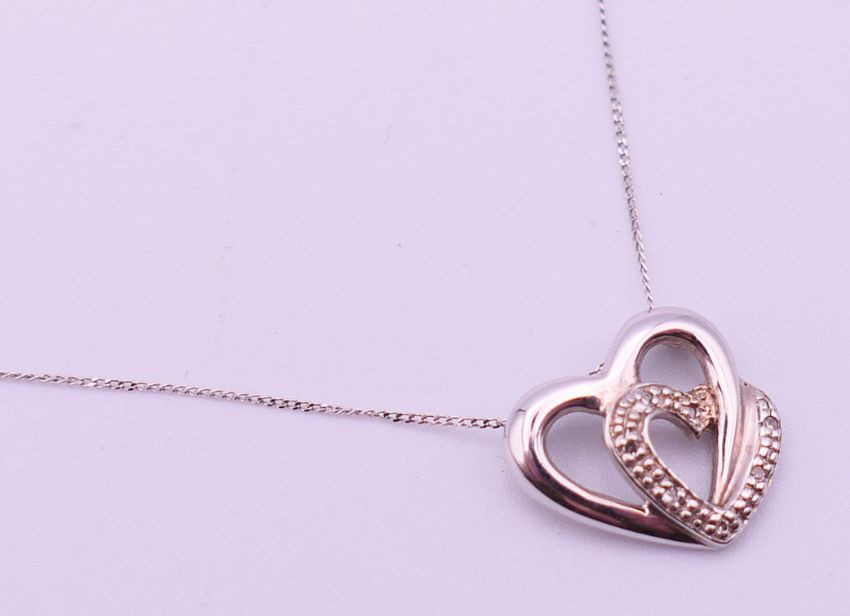 A 9 ct white gold and diamond double heat pendant on a 9 ct white gold chain. Pendant 1.25 cm high, chain 46 cm long. 1.4 grammes total weight.