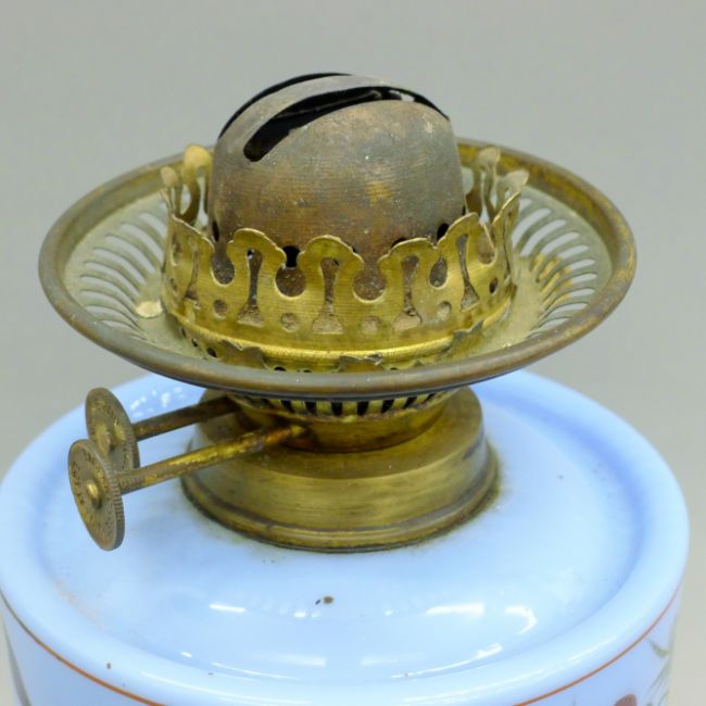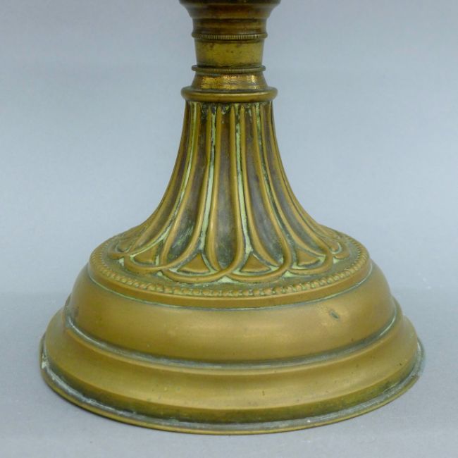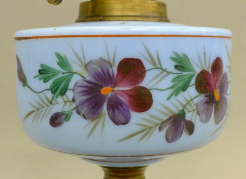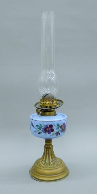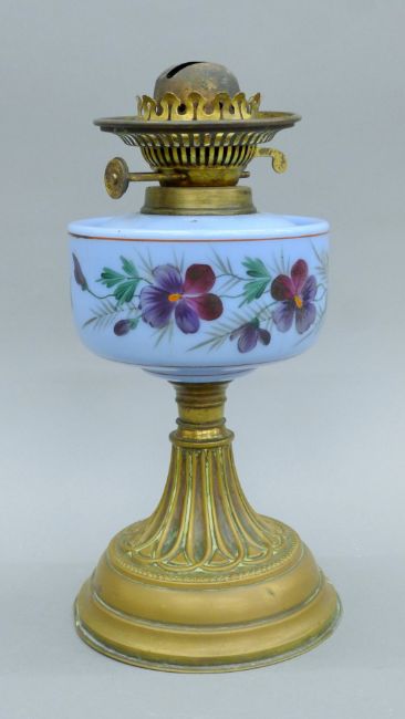 A Victorian brass and painted glass oil lamp. 31 cm high excluding chimney.
