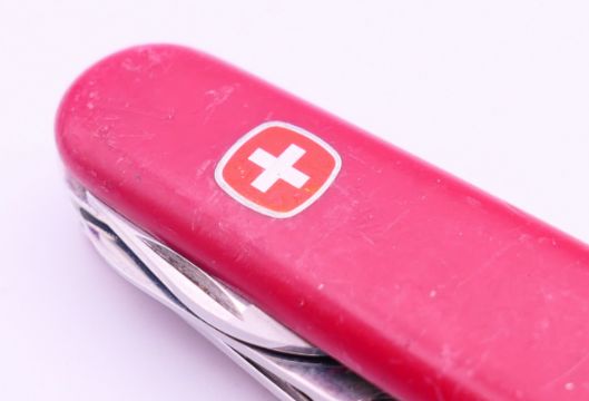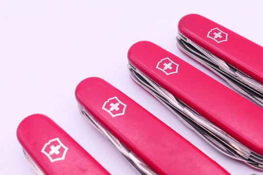 Five various Swiss Army penknives. The largest 9 cm long closed.