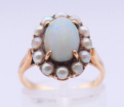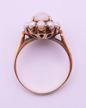 An unmarked gold, opal and seed pearl ring. Ring size M/N. 4 grammes total weight.