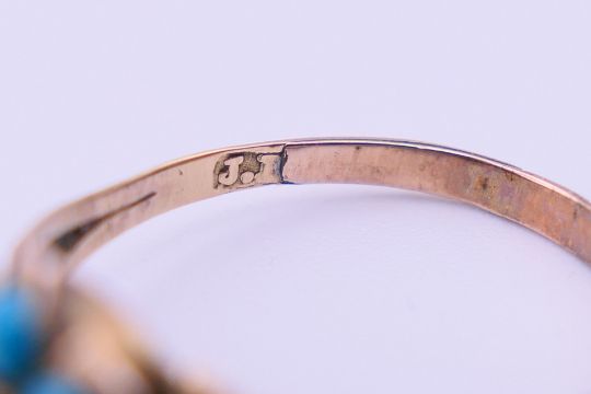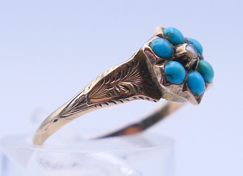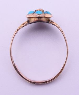 An unmarked antique 9 ct gold and turquoise ring. Ring size N. 1.4 grammes total weight.