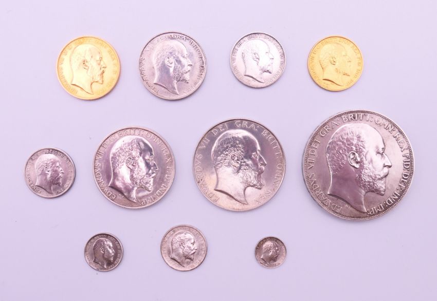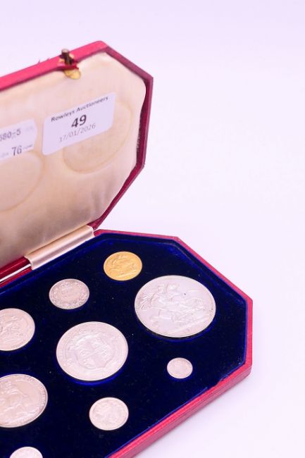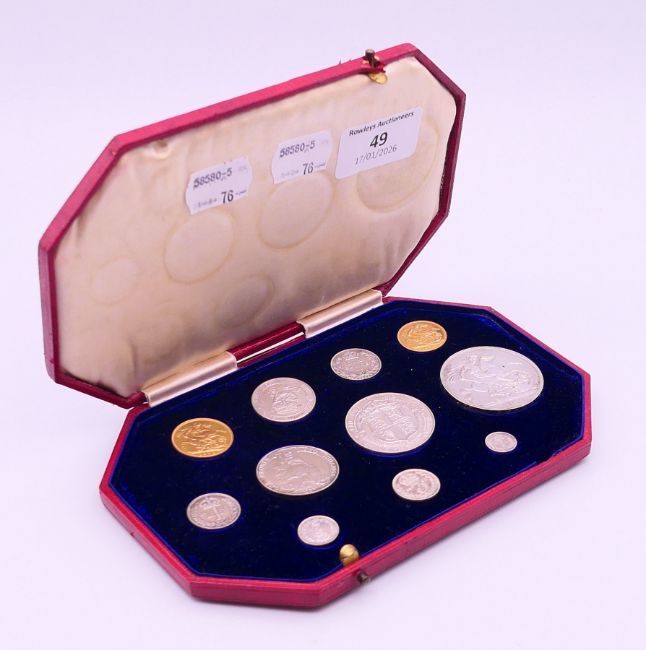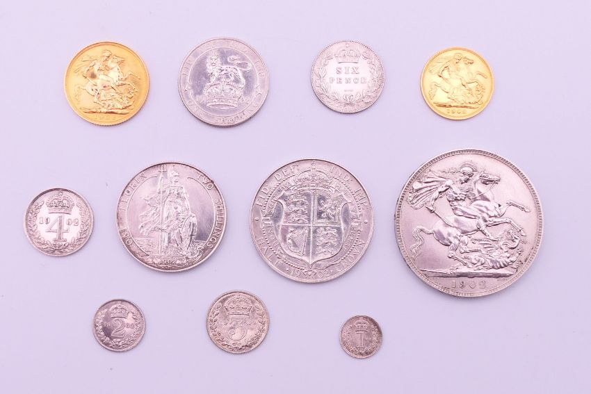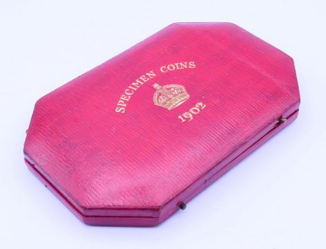 A cased 1902 specimen coin set - 1 pence coin to a sovereign. Case 18 x 11.5 cm.