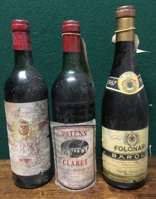 Clos Ferrand Appellation St. Estephe 1967Single bottle; together with Patens Claret, single bottle; and Folonari Barolo 1967, single bottle. (3) CONDITION REPORTS: Generally good with expected wear, some scuffing/staining to labels, patens label loose, levels upper shoulder, upper shoulder and lower neck respectively.