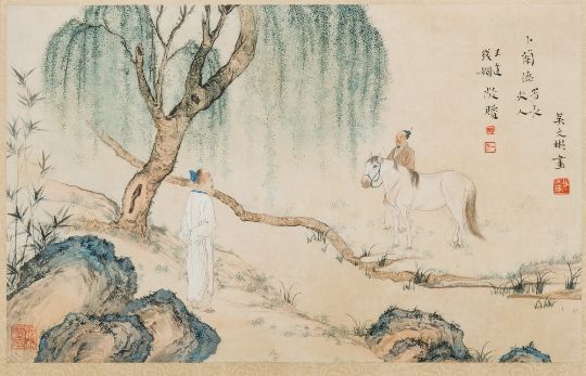 CHINESE SCHOOL (19th century)Two Figures and a Horse in a River LandscapeWatercolour, signed with calligraphic text and red seal marks, framed and glazed. 53.5 x 34.5 cm. CONDITION REPORTS: Generally good condition, expected wear, some slight staining/fading.