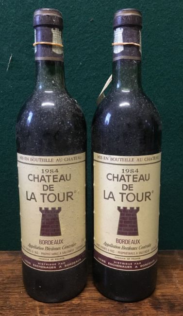 Chateau de la Tour Bordeaux 1984Two bottles. (2) CONDITION REPORTS: Generally good with expected wear, some scuffing/staining to labels, levels lower neck.