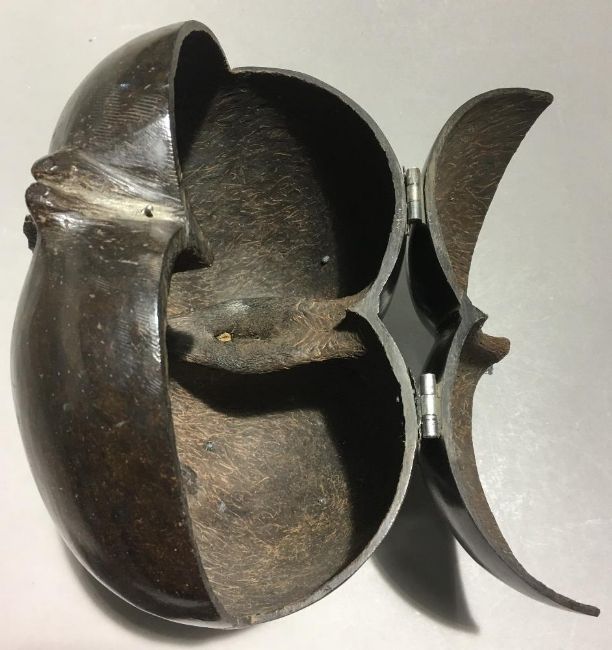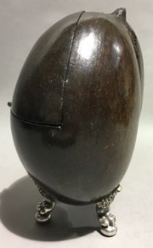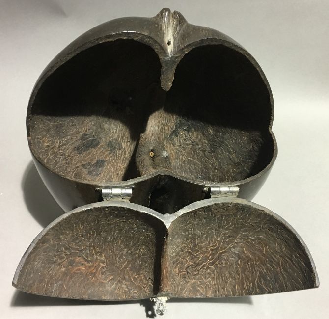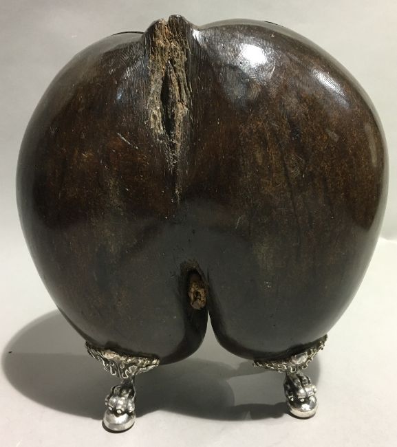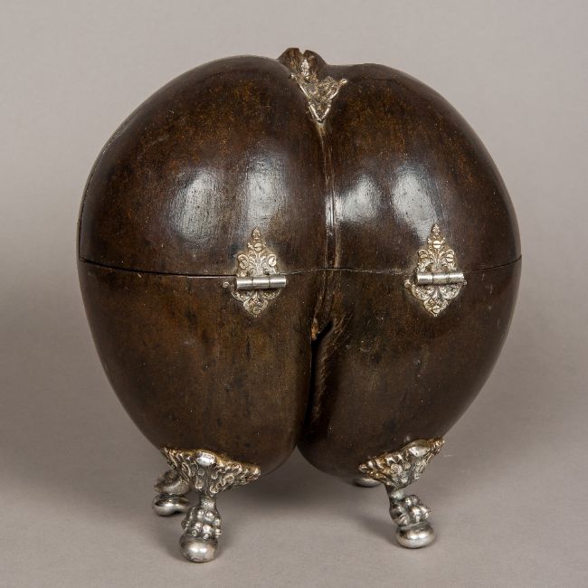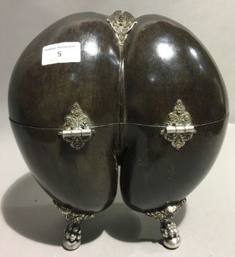 A 19th century white metal mounted coco-de-mer Hinged as a box, mounted on cast ball-and-claw feet. 26 cm high. CONDITION REPORTS: Generally in good condition, general wear.