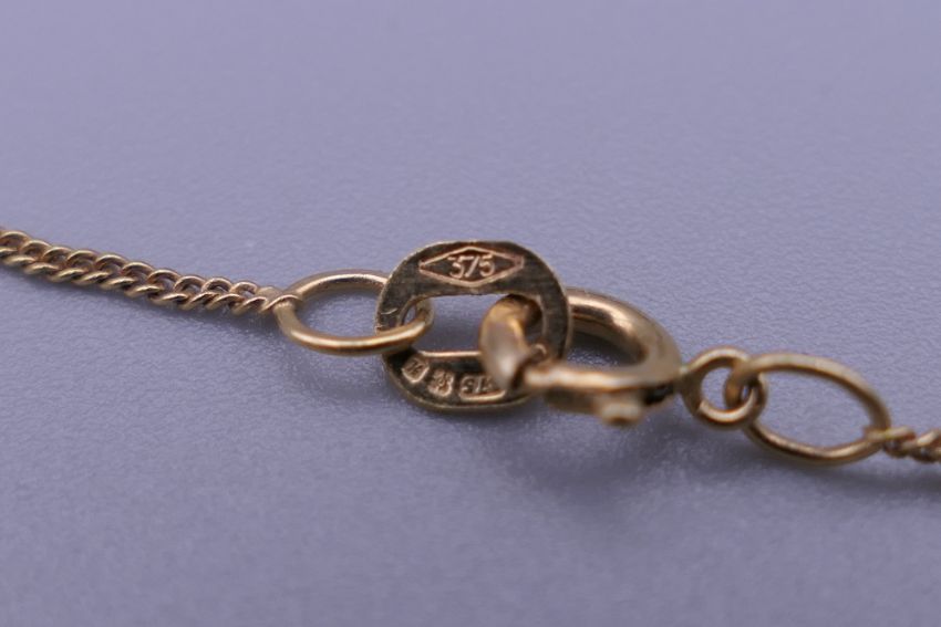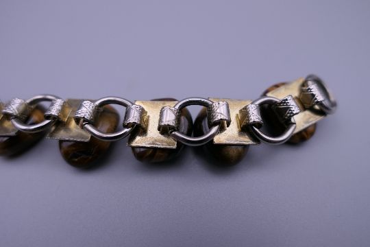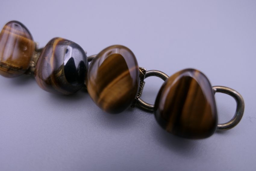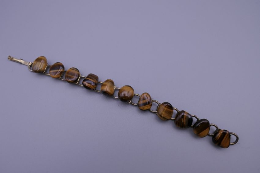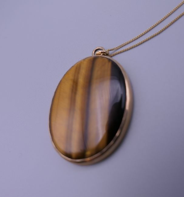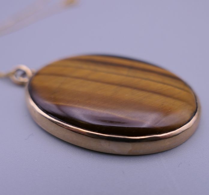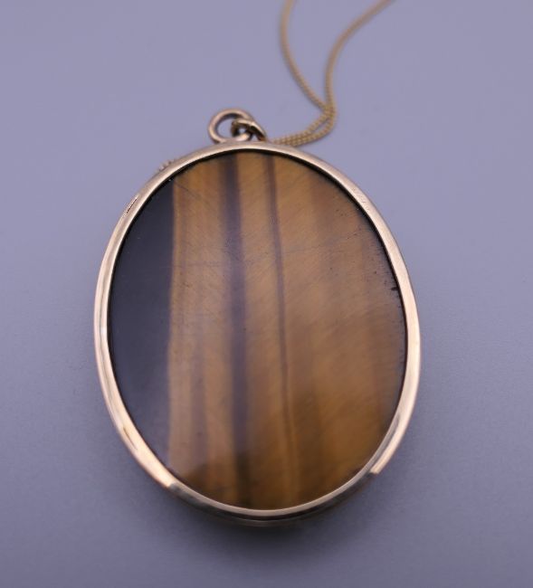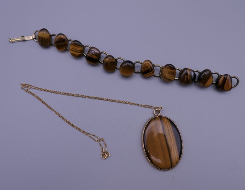 A tigers eye pendant on a 9 ct gold chain and a tigers eye bracelet. The latter 17 cm long.
