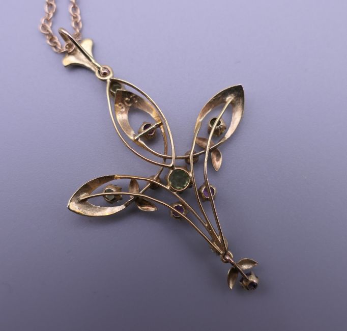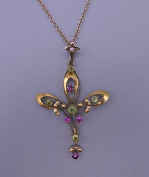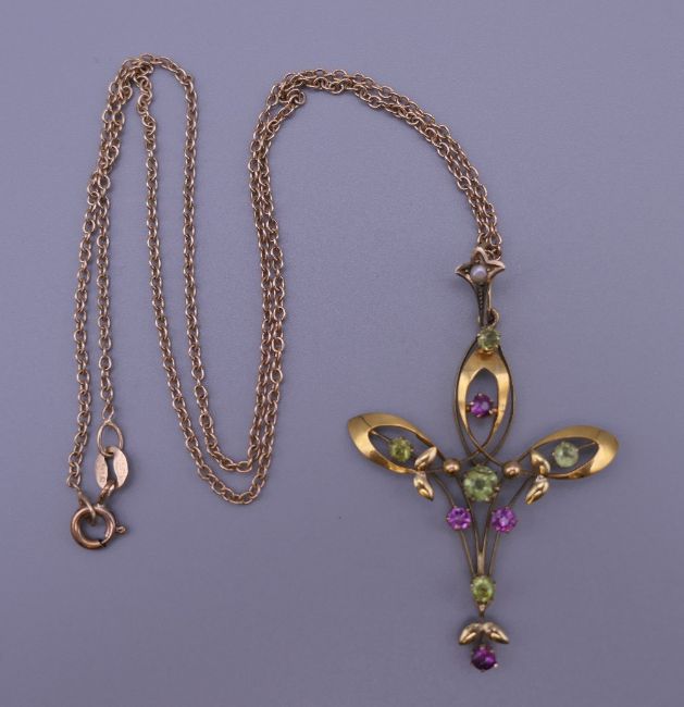 An Art Nouveau 9 ct gold pendant on a 9 ct gold chain. 4.5 cm high. 4.2 grammes total weight.
