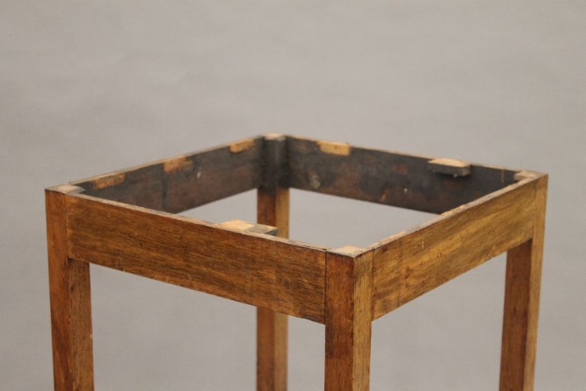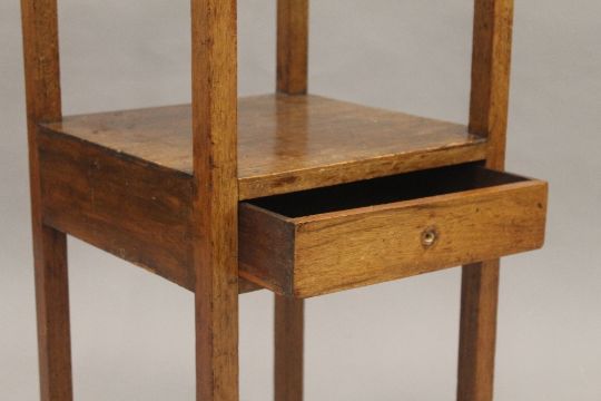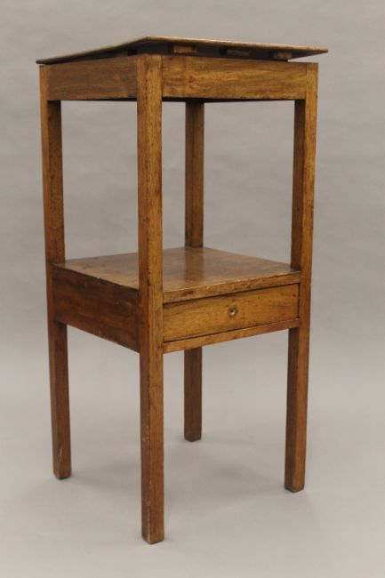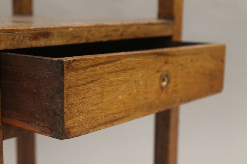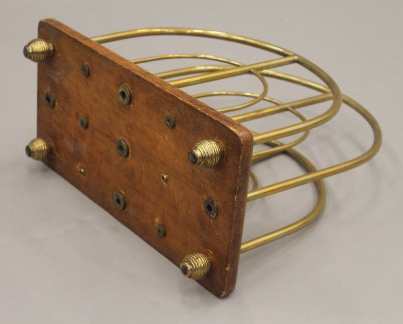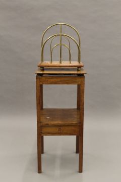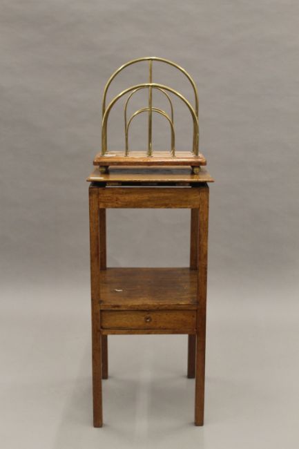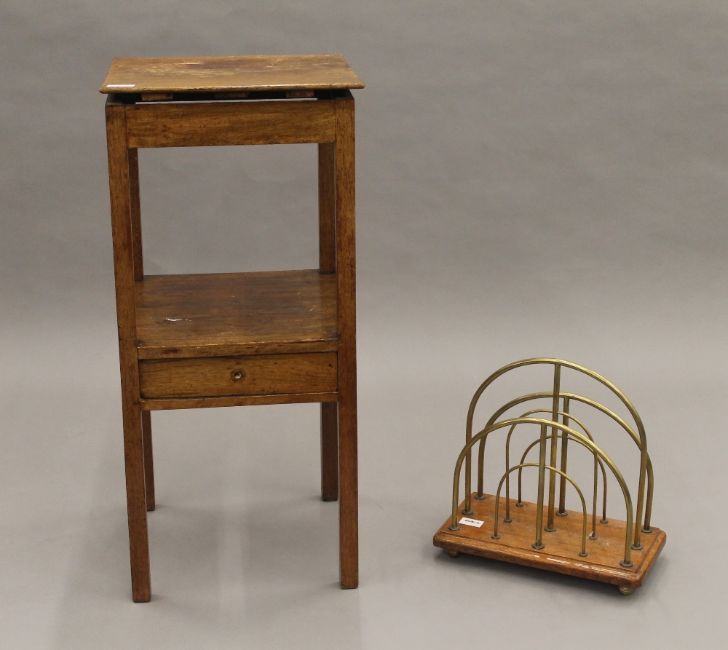 A Victorian brass and oak magazine rack and a mahogany nightstand. The former 35 cm wide.