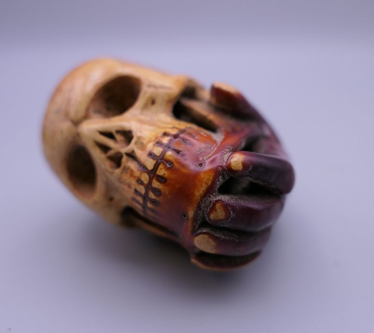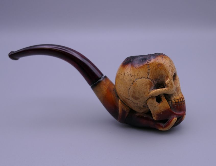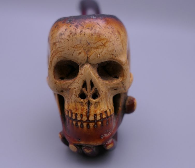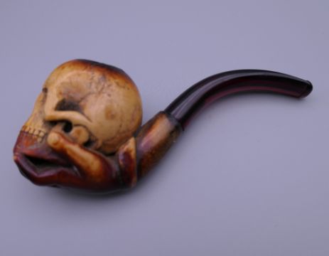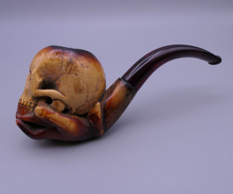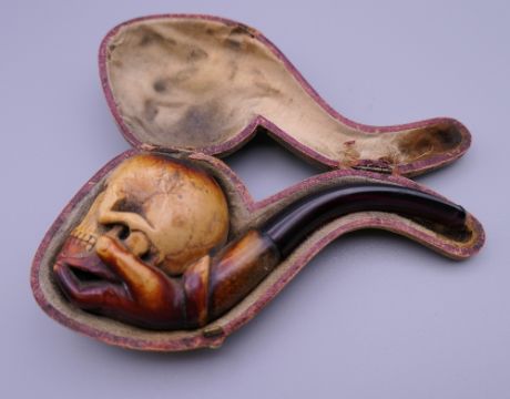 A cased Victorian Meerschaum pipe formed as a skull and hand. 13 cm long.