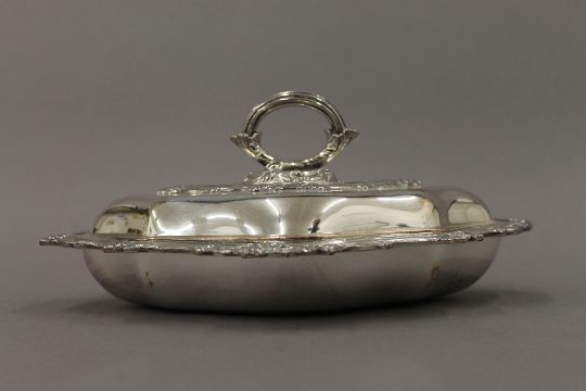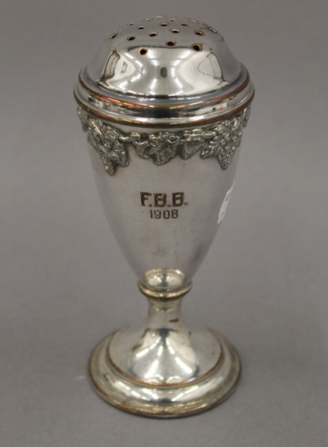 Two silver brushes, a plated castor and a small plated entree dish. The castor 16 cm high.