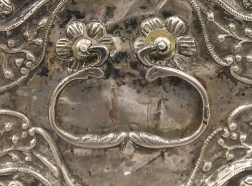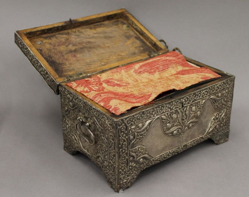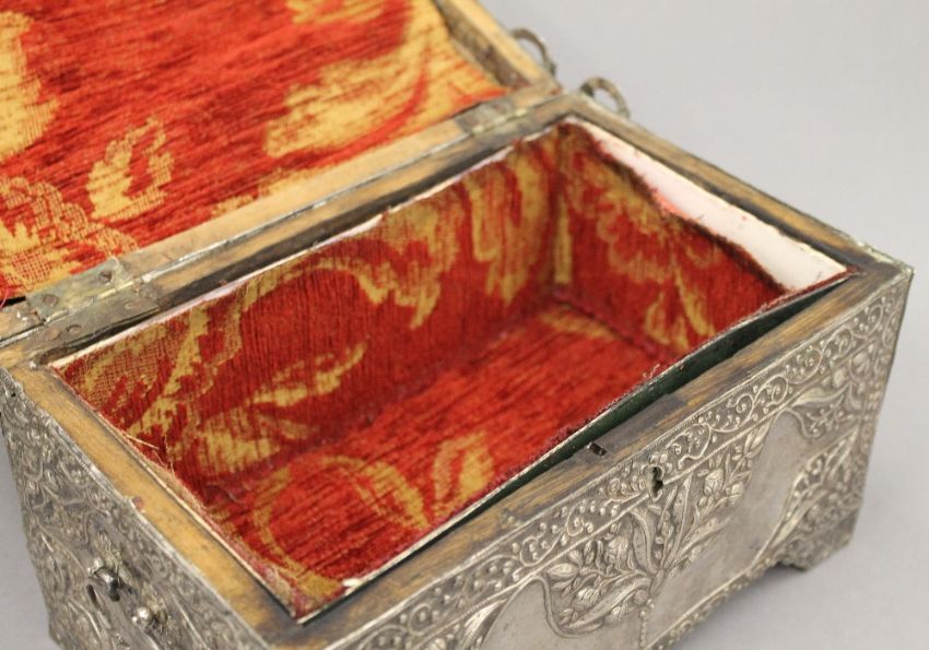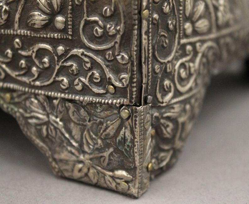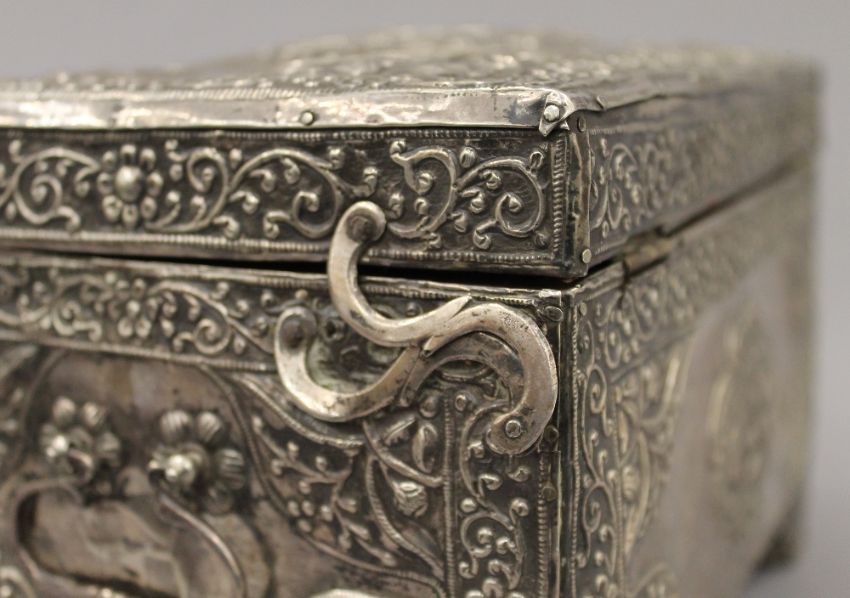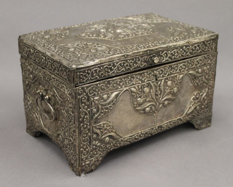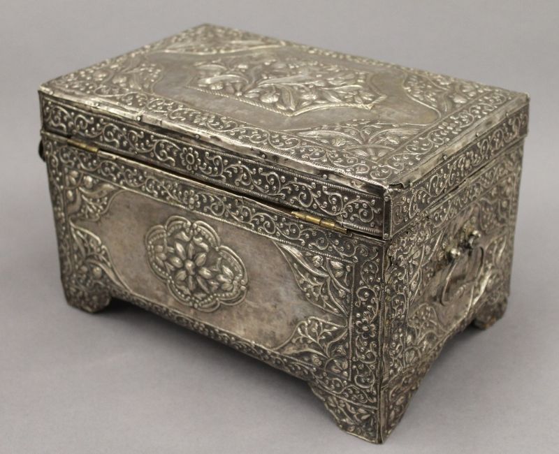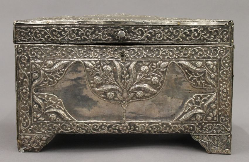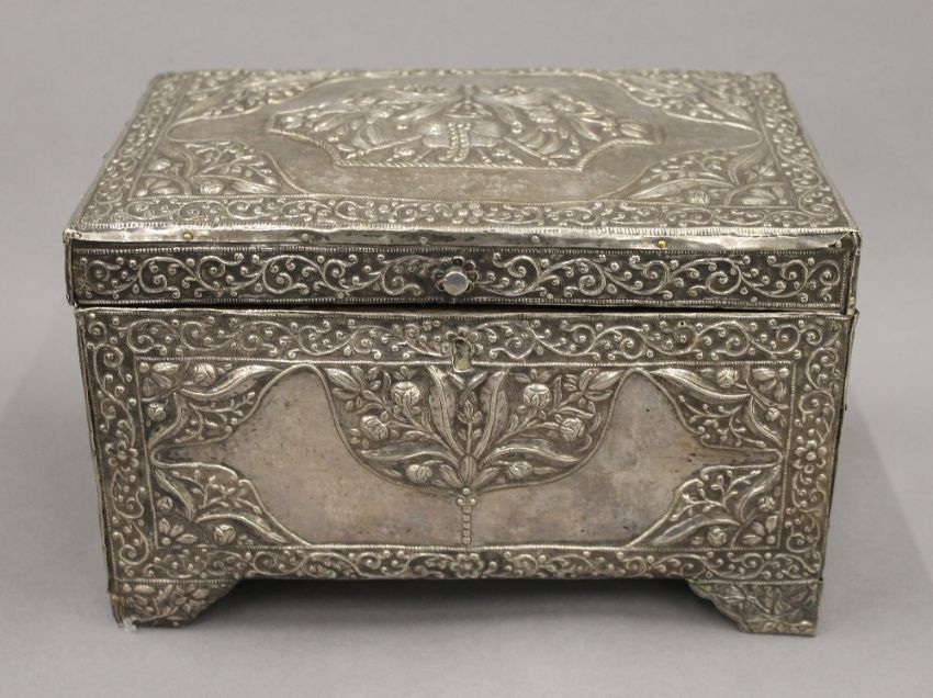 An 18th/19th century Eastern, probably Persian unmarked silver clad casket. 25 cm wide. 53 troy ounces total weight.
