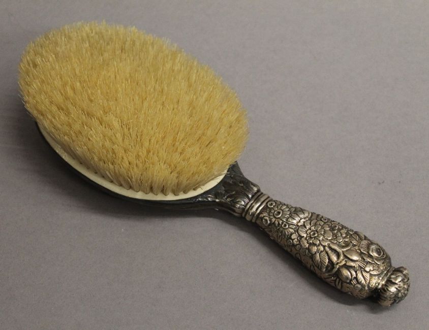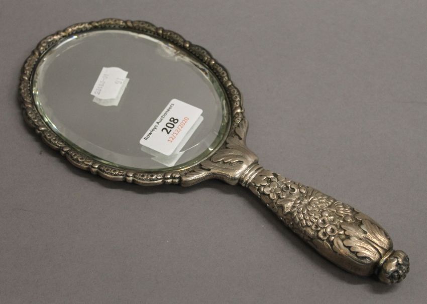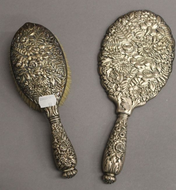 A Tiffany & Co sterling silver mirror and brush. The former 27 cm long. 16.4 troy ounces total weight.