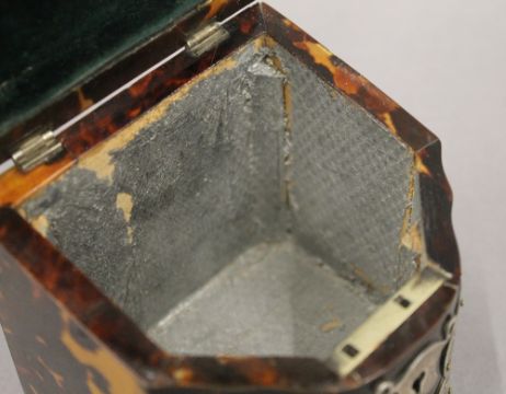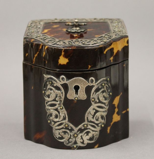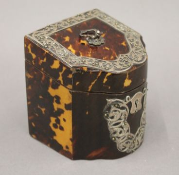 A Victorian silver mounted tortoiseshell tea caddy. 10 cm high.
