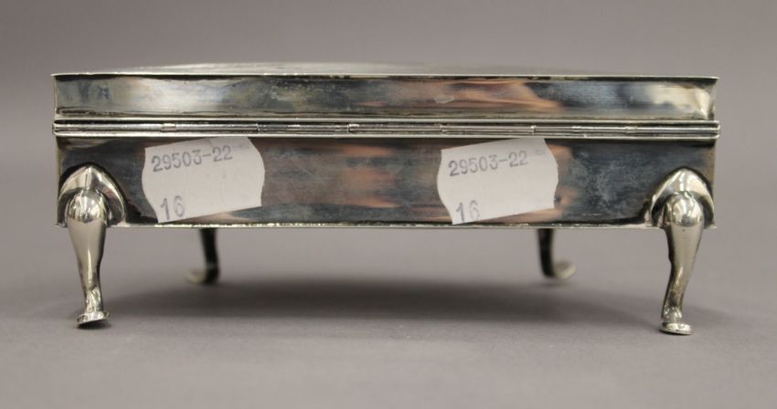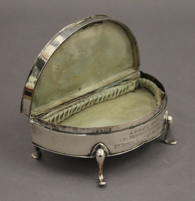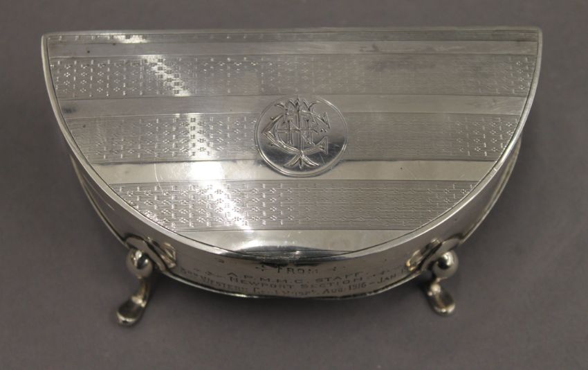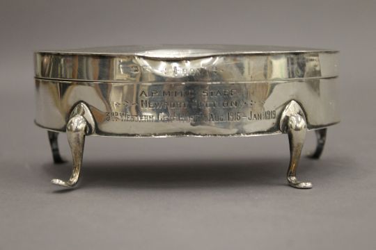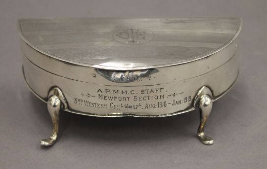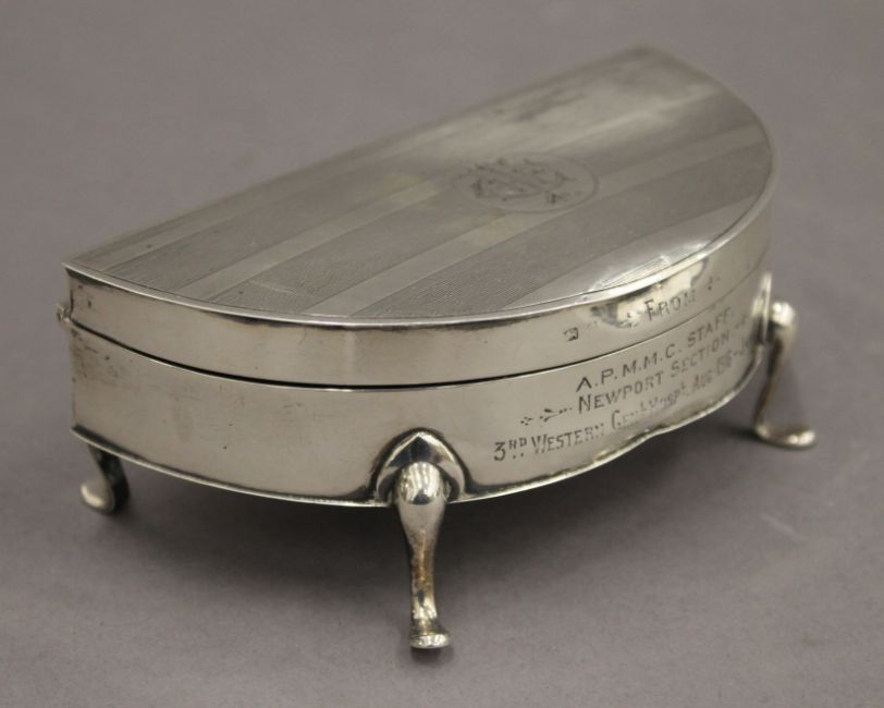 An early 20th century silver trinket box with Almeric Paget Military Massage Corps silver presentation inscription. 14 cm wide. 7.8 troy ounces total weight.Miss Dorothy Paget was the daughter of Lord Queenborough.