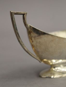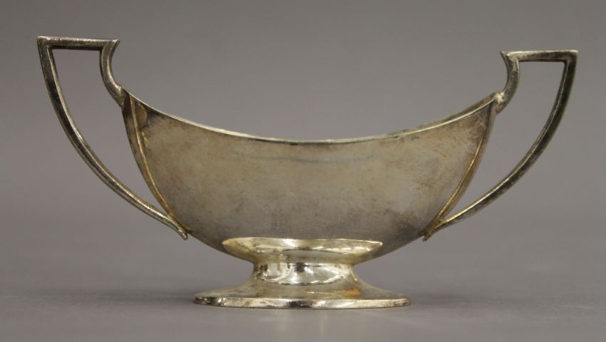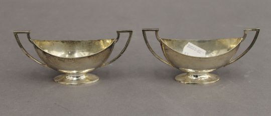 WITHDRAWN A pair of silver twin handled pedestal salts. 12.25 cm wide. 3.9 troy ounces.