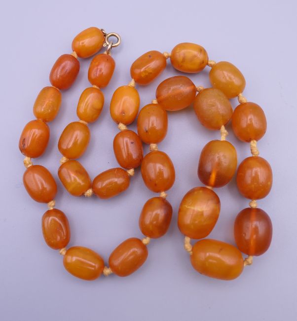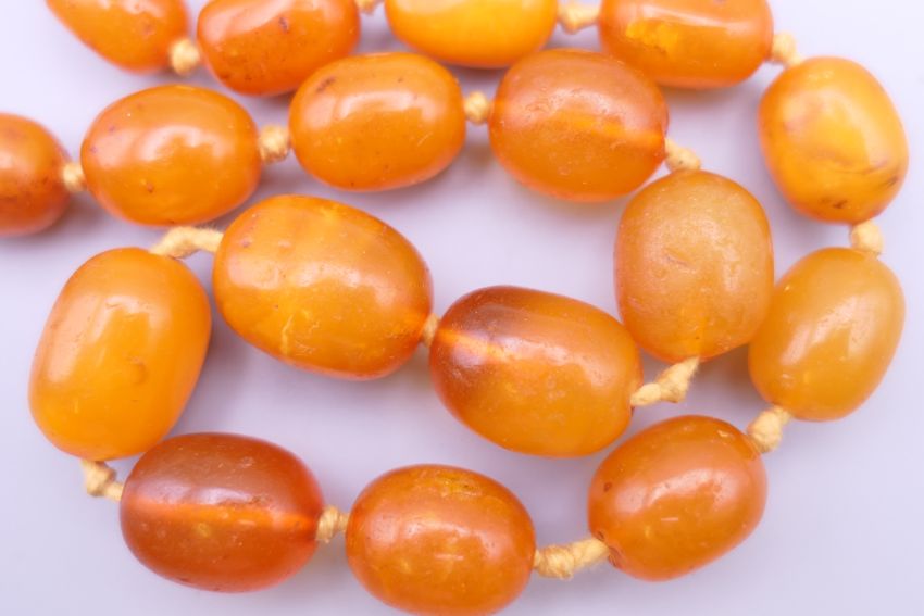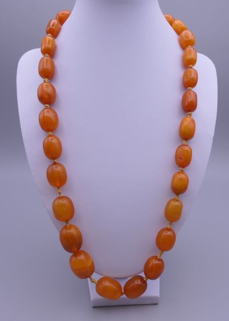 A butterscotch amber string of beads, 29 in total. Approximately 60 grammes. Approximately 60 cm long.