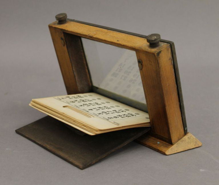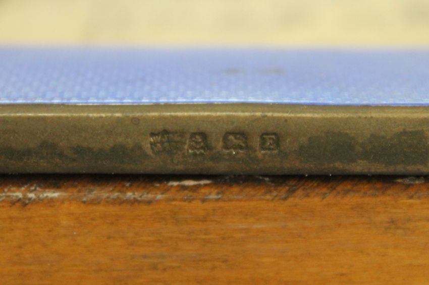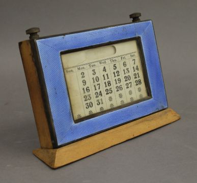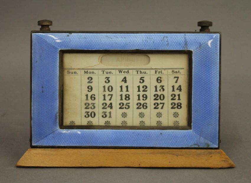 An enamel decorated silver desk calendar. 13 cm high.
