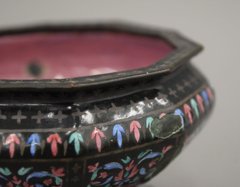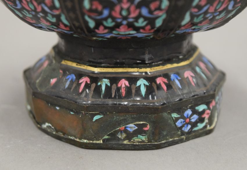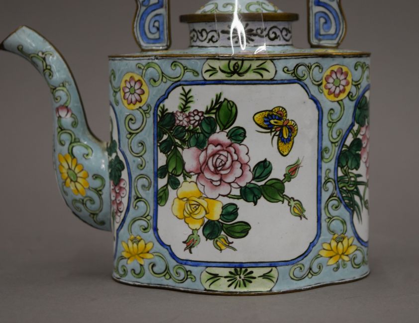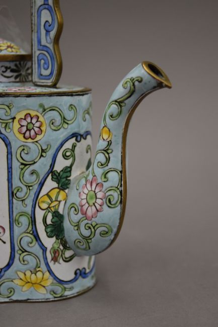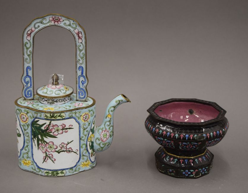 An 18th century Chinese Canton enamel hexagonal footed bowl in the Limoges style and a later Canton enamel wine pot. The latter 21 cm high.