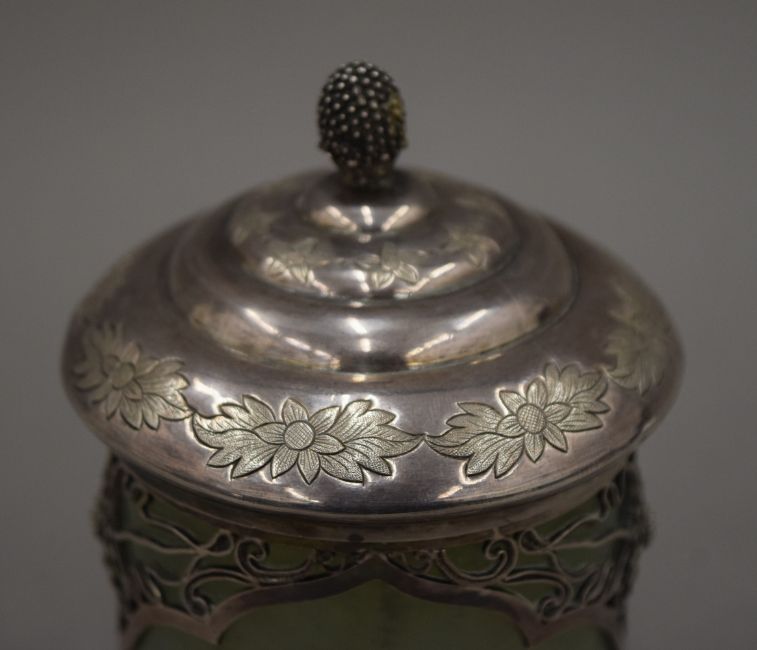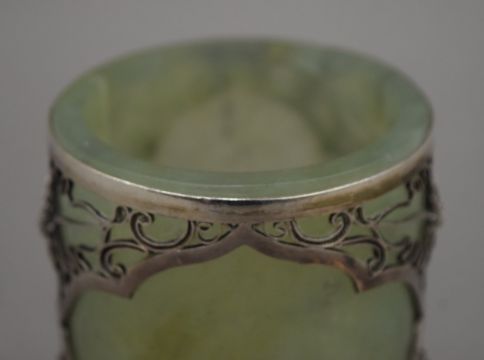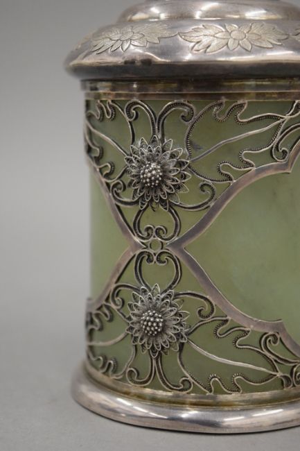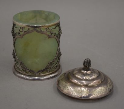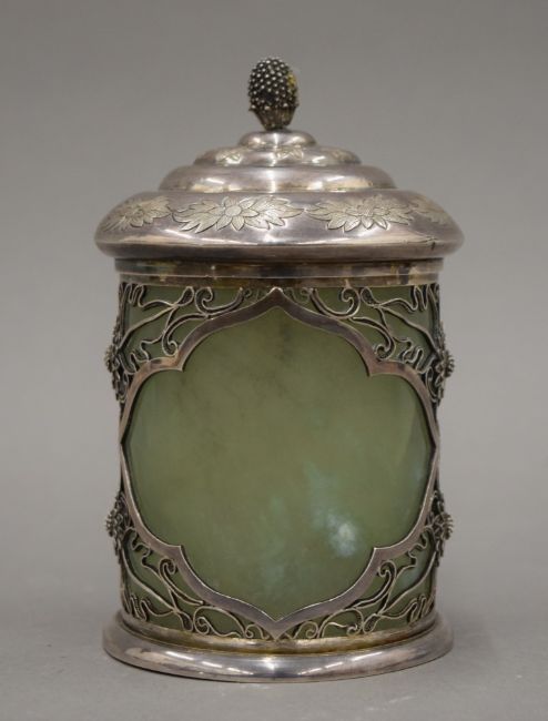 A silver mounted cylindrical jade lidded box. 12.5 cm high.