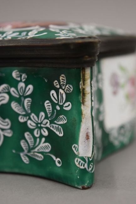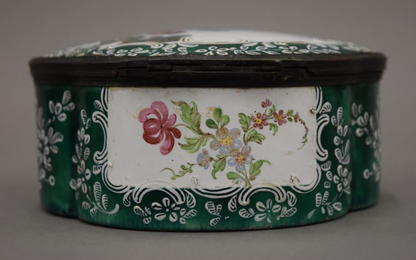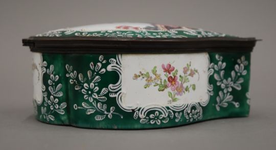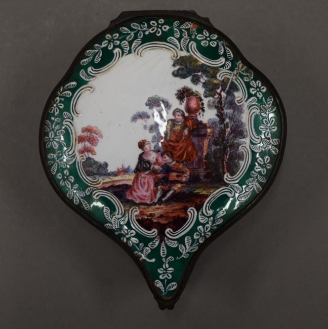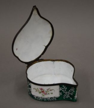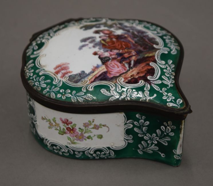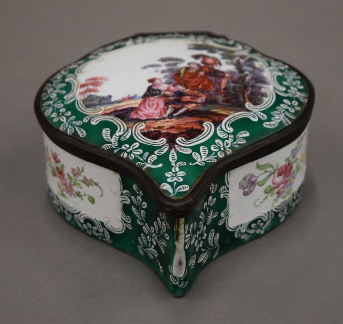 A large 19th century enamel on copper hand painted box, painted with classical figures in a landscape. 16 cm long.