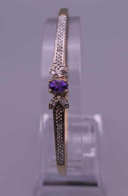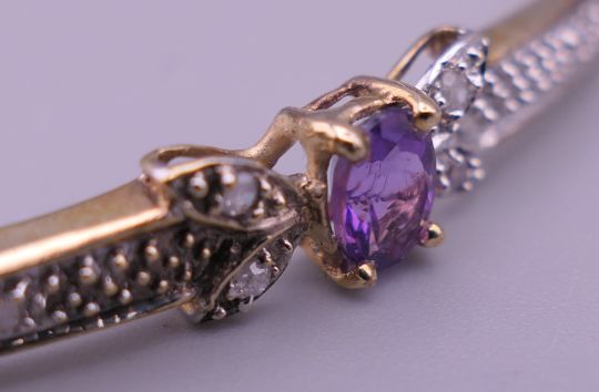 A 9 ct gold diamond and amethyst bangle. 6.5 cm wide. 7.6 grammes total weight.