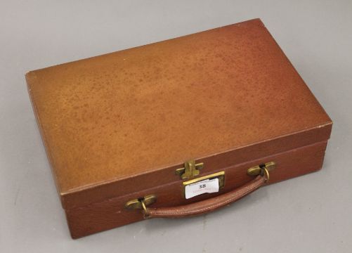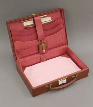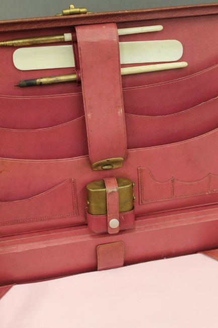 A leather writing case with inkwell, letter opener and pens. 30.5 cm wide.