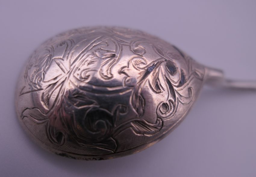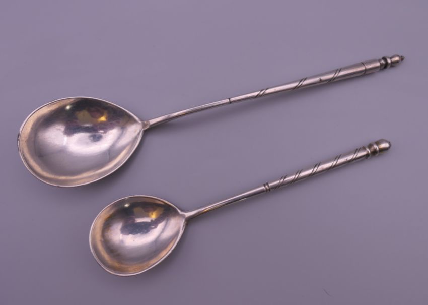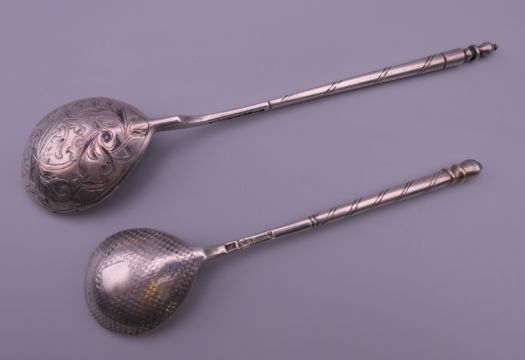 Two Russian silver spoons. The largest 17 cm long. 62.8 grammes.
