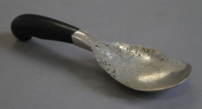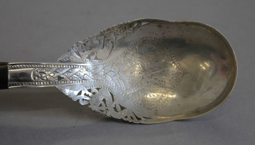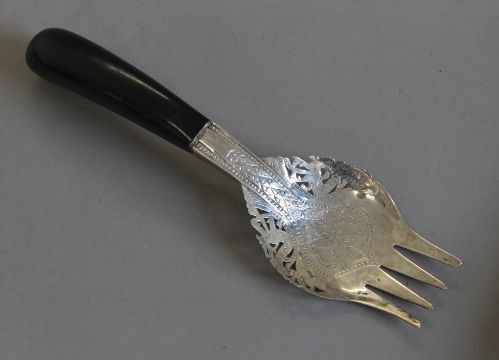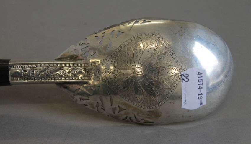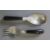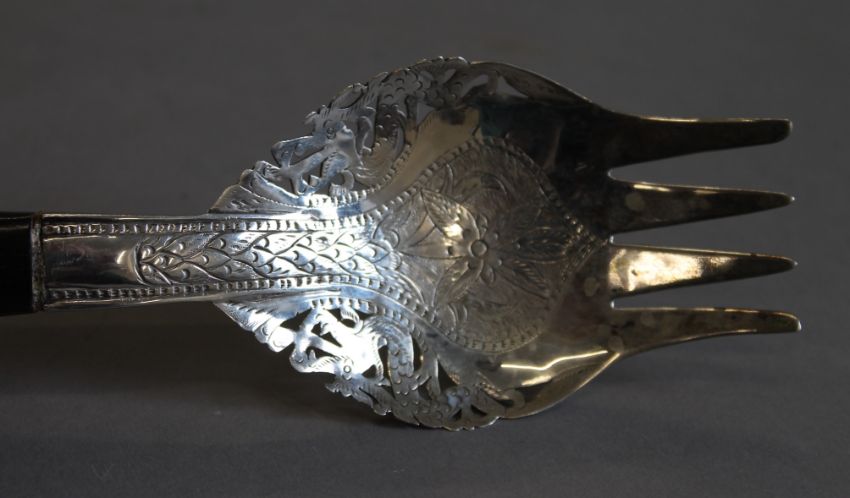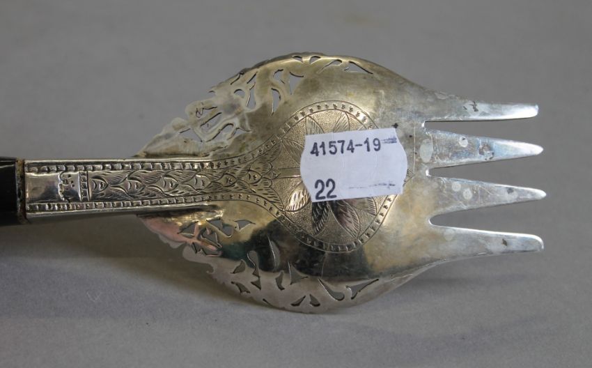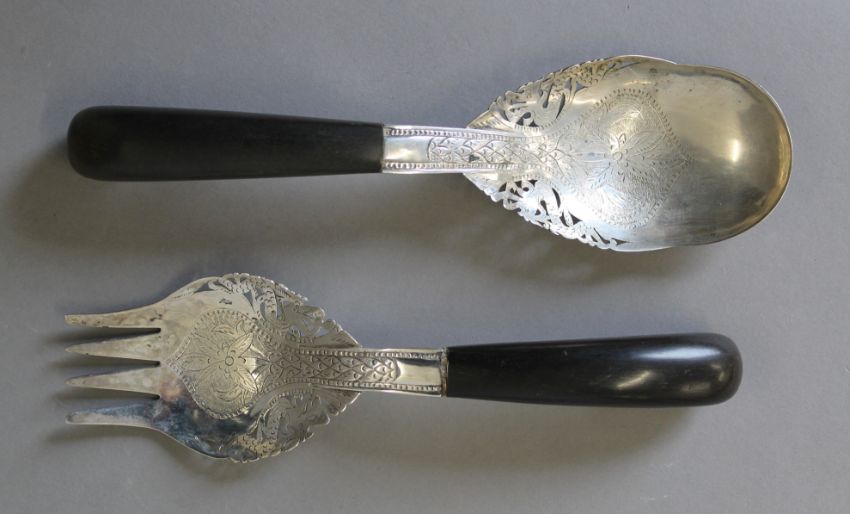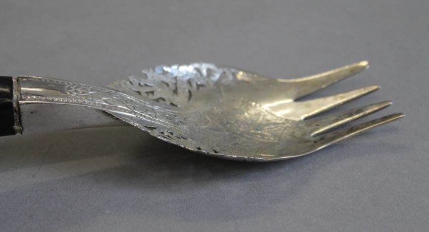 A pair of Eastern unmarked white metal salad servers with horn handles. The spoon 24 cm long.