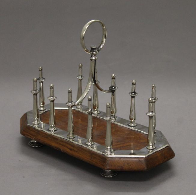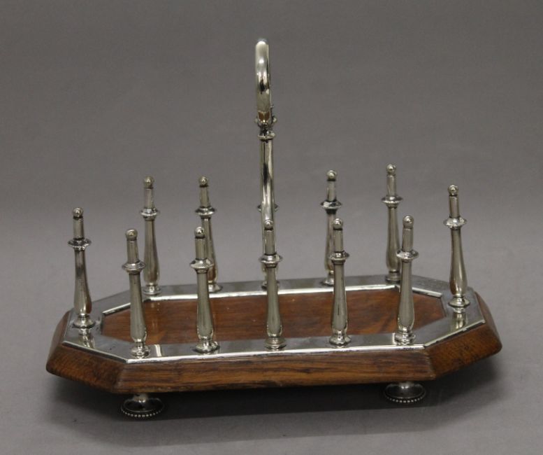 A Victorian silver plated and oak toast rack. 18.5 cm long.