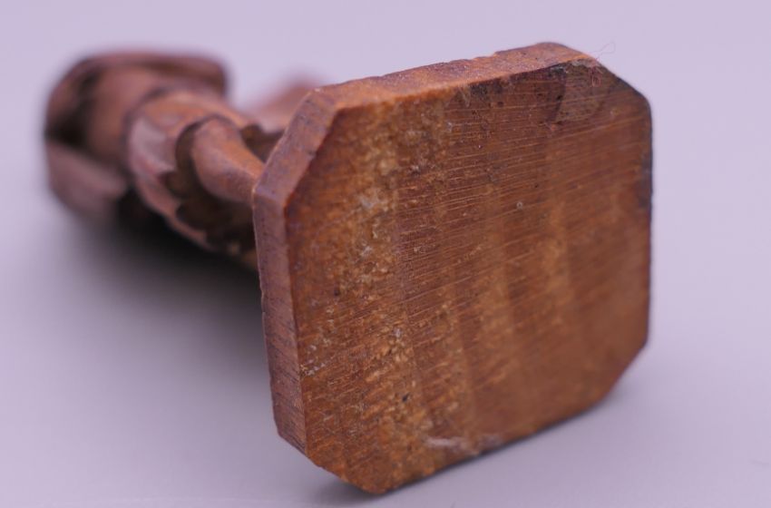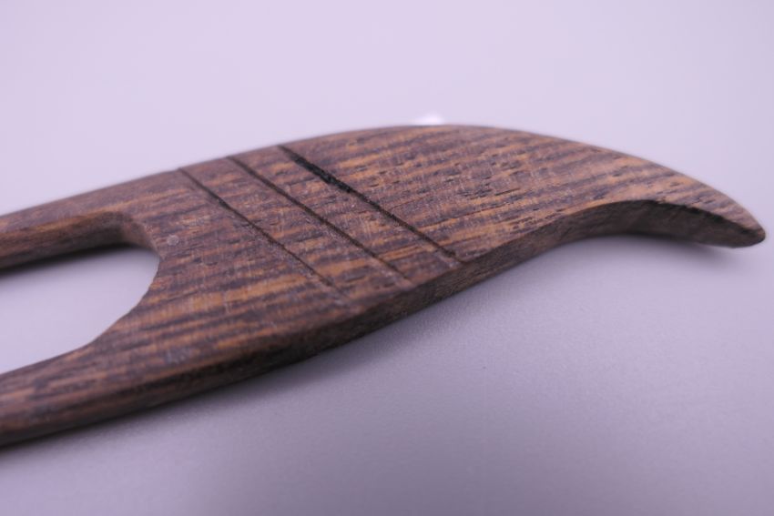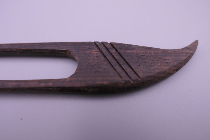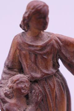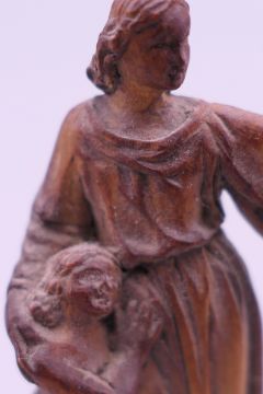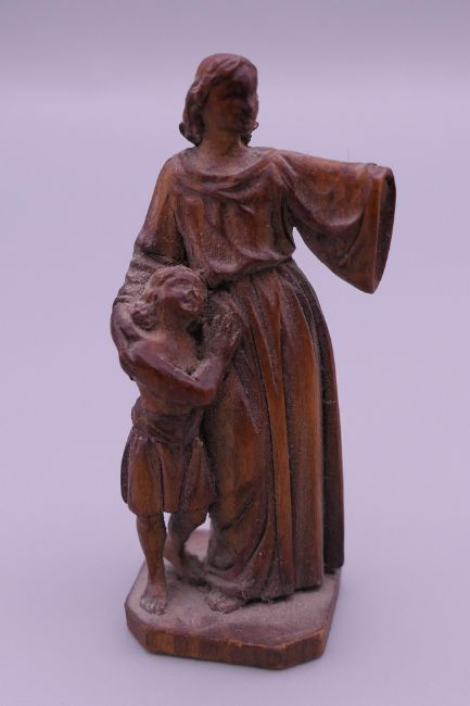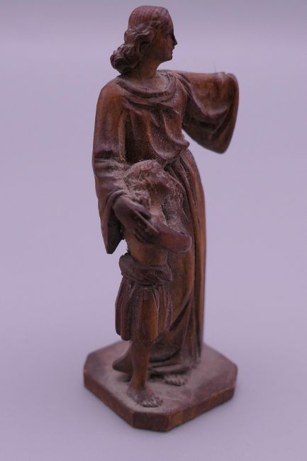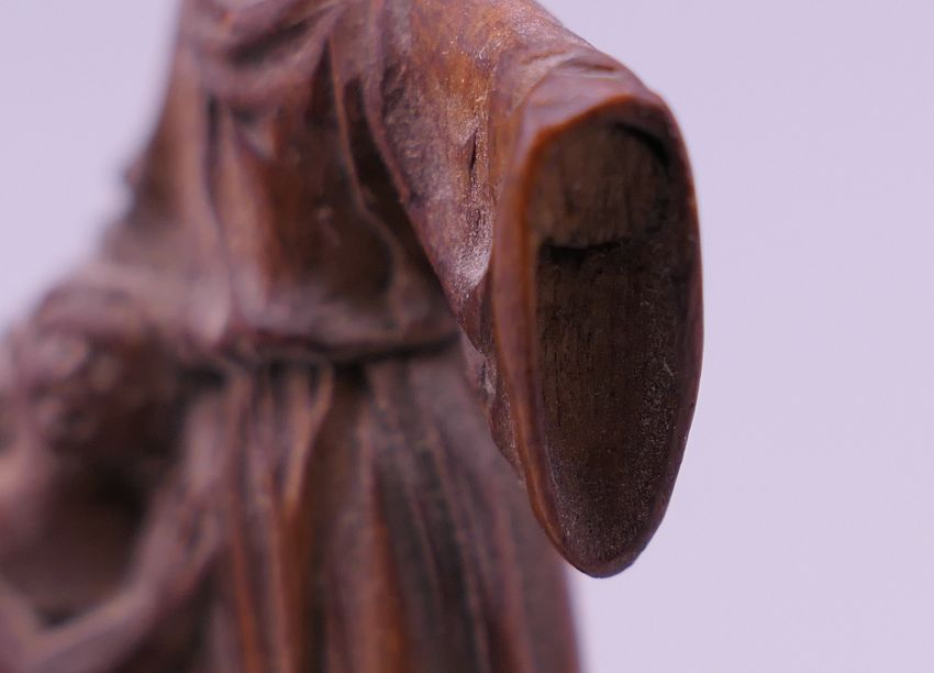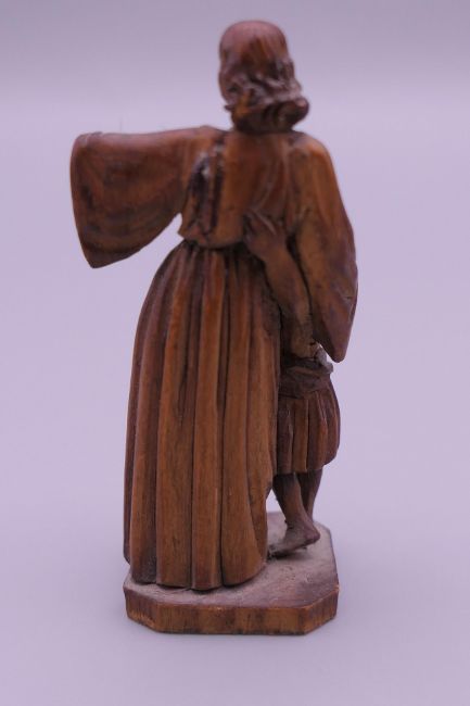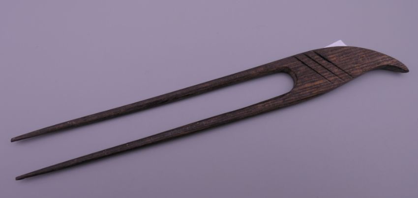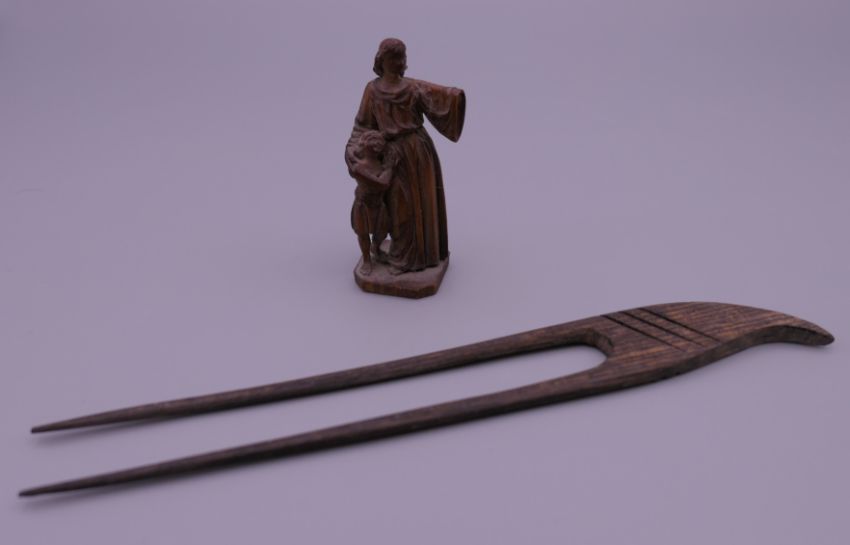 A small 19th century carved wooden model of The Madonna and Child, and a Japanese hair pin. The former 5.5 cm high.