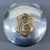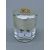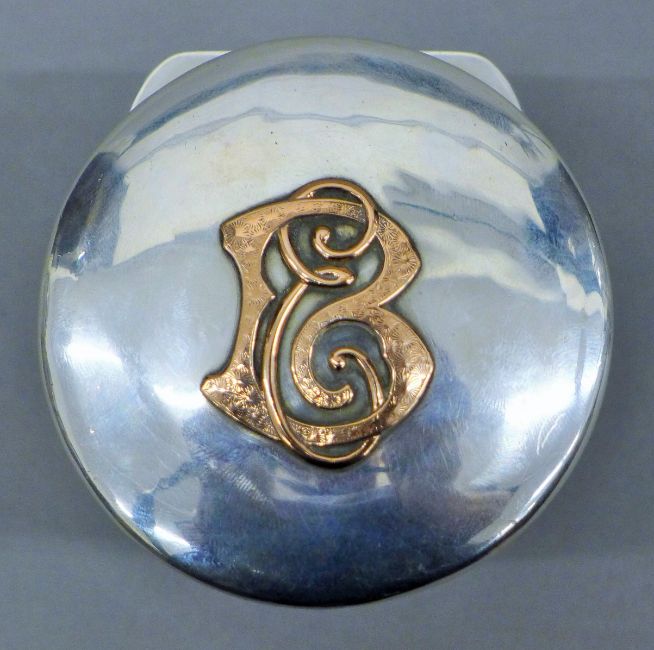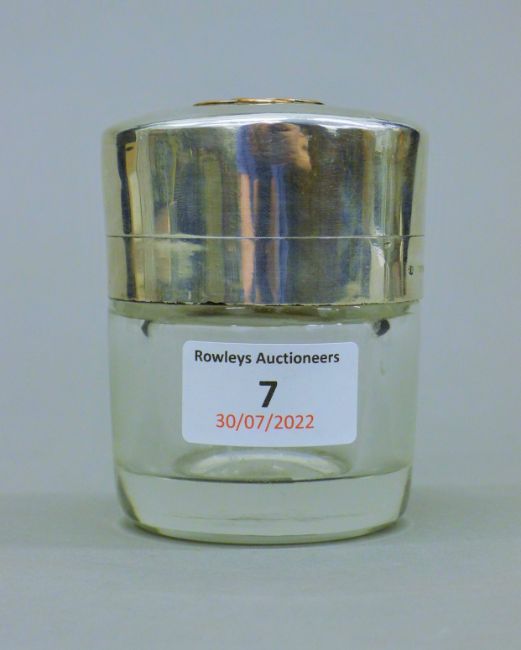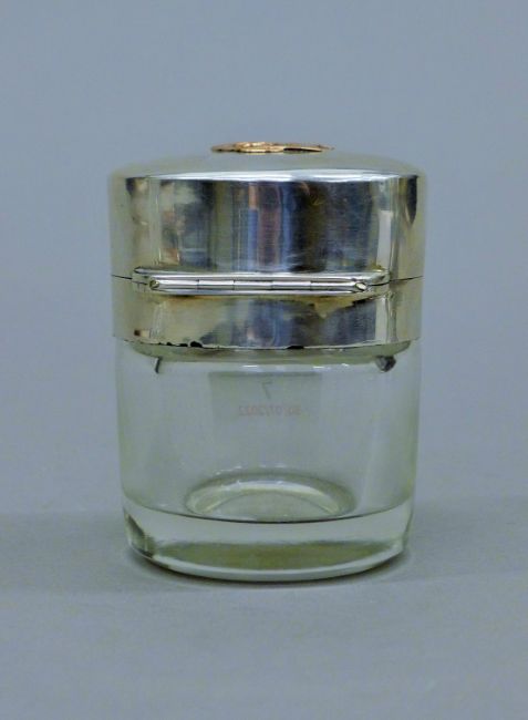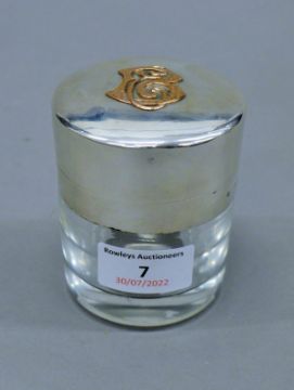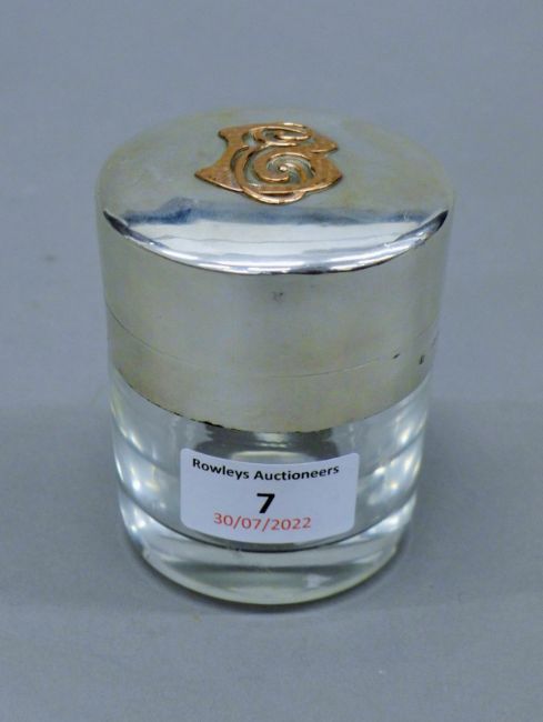 A silver dressing table pot, with unmarked gold lettering, hallmarked for London 1887, maker's mark for Jane Brownett. 8.5 cm high.
