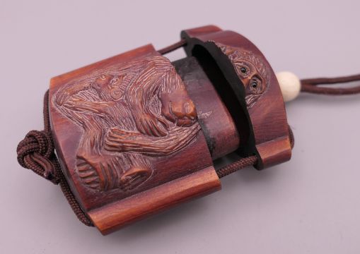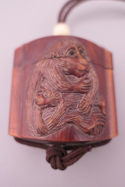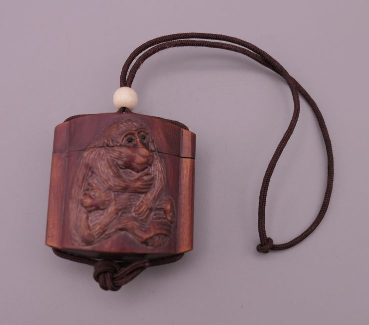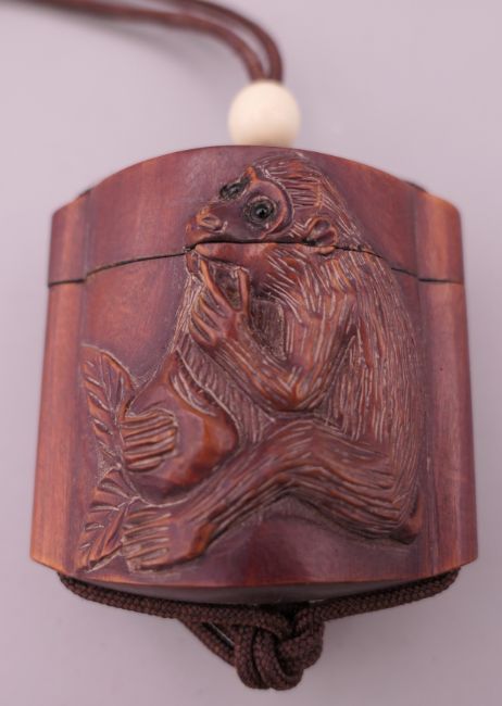 A small inro decorated with monkeys. 4 cm high.