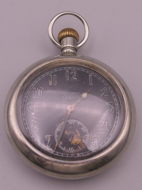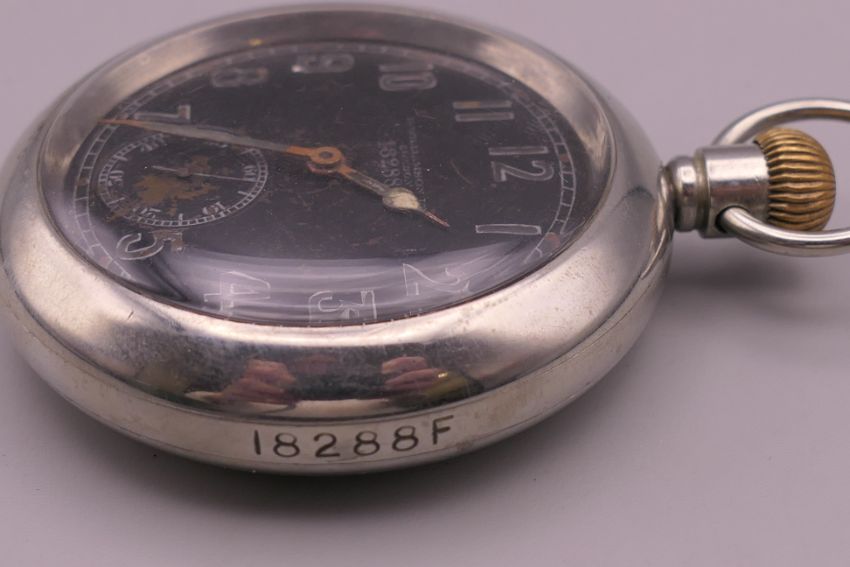 A silver plated military pocket watch. 5.5 cm diameter.