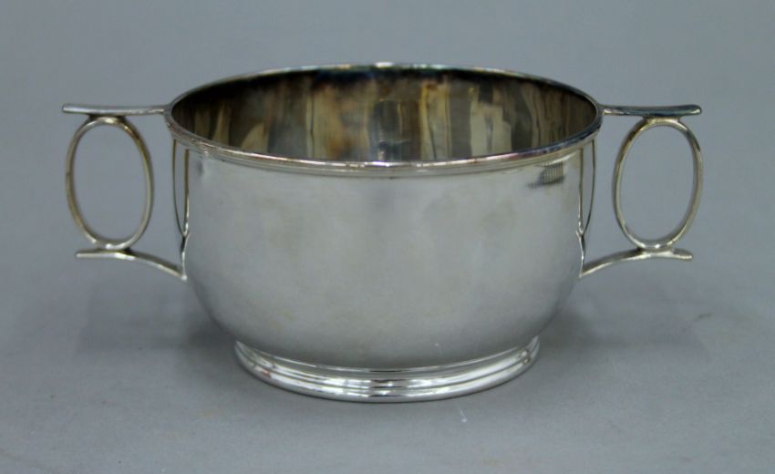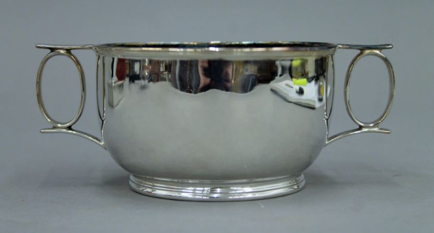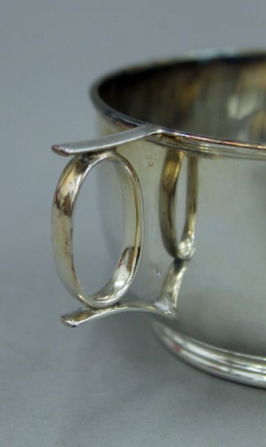 A small silver two handled bowl, hallmarked for Sheffield 1915 Edward and Sons. 6 cm high. 4.5 troy ounces.