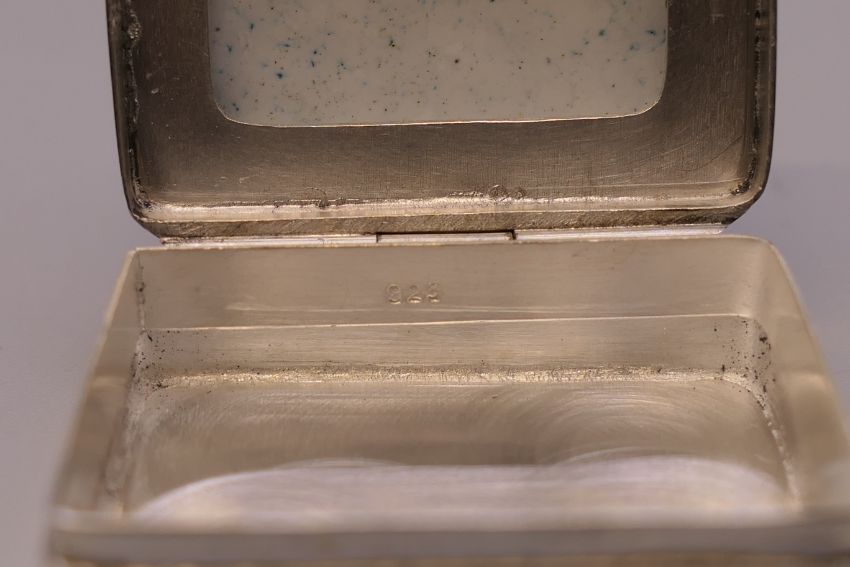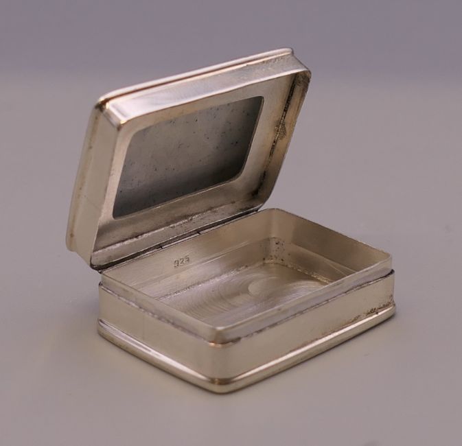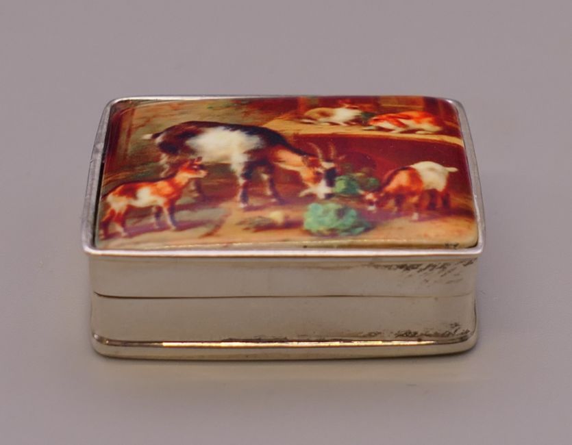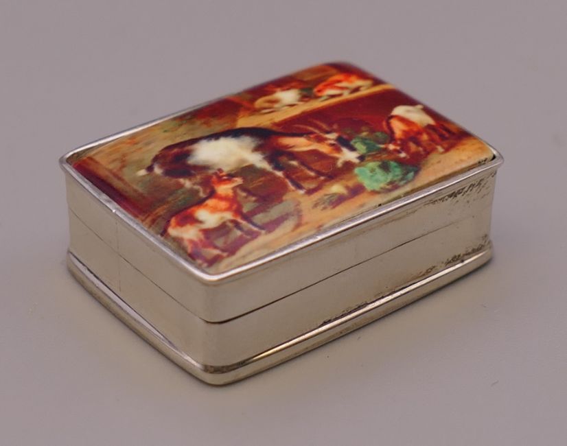 A silver pill box depicting a farm yard scene. 3 cm wide.