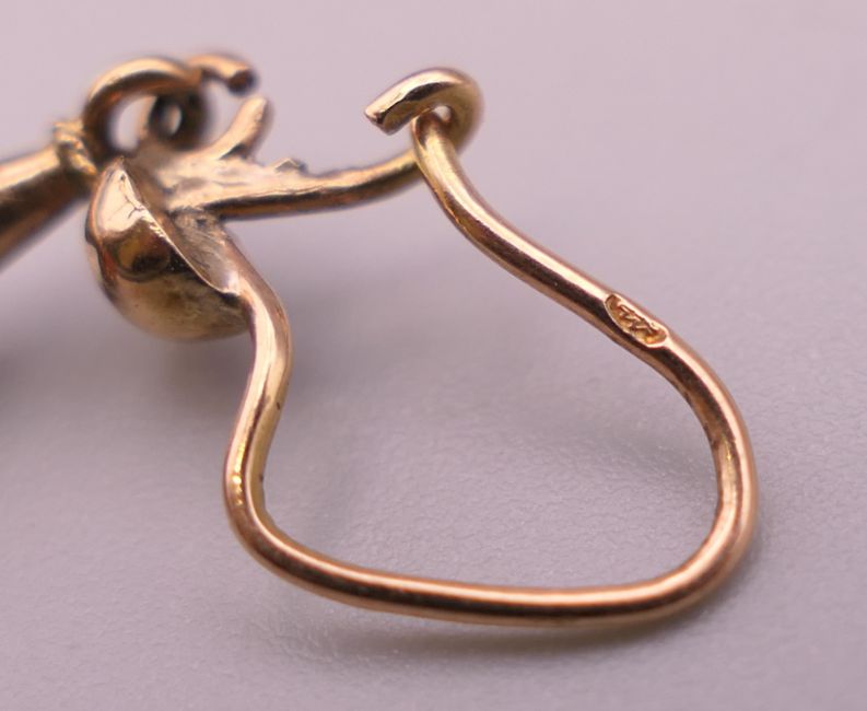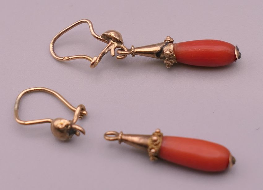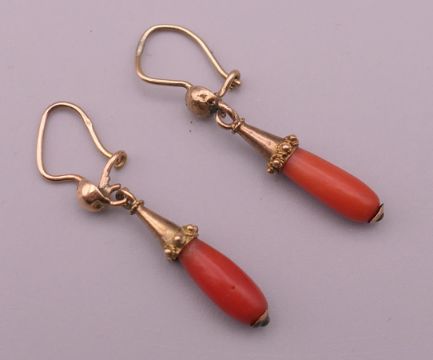 A pair of gold coral drop earrings. 2 cm high excluding suspension hook.