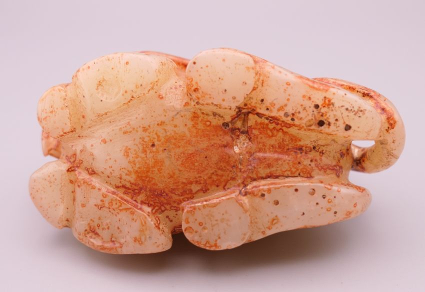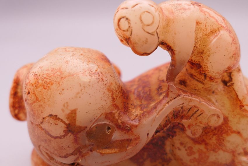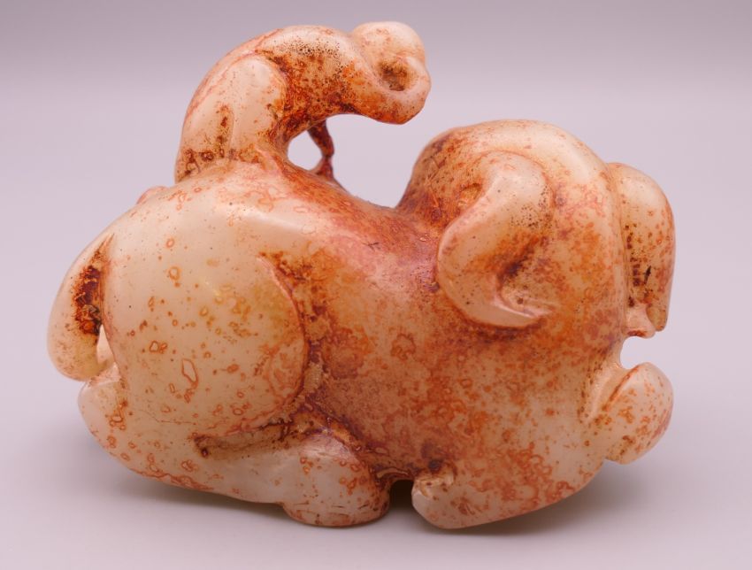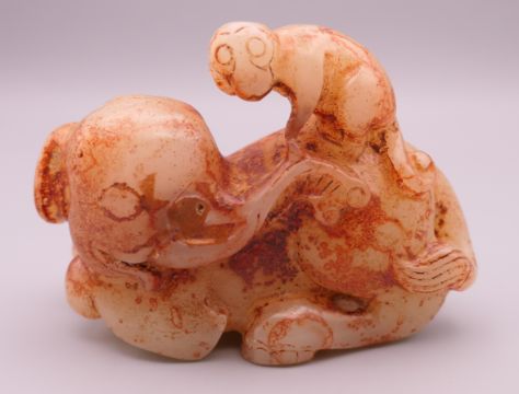 A russet jade model of an elephant and monkey. 8.5 cm long.