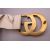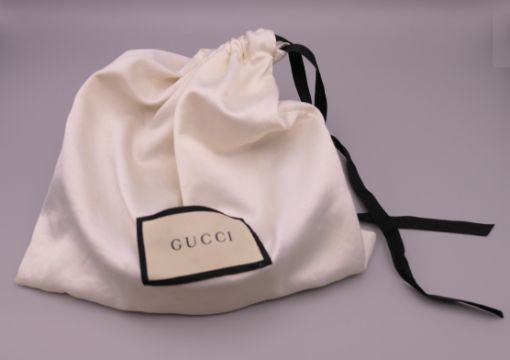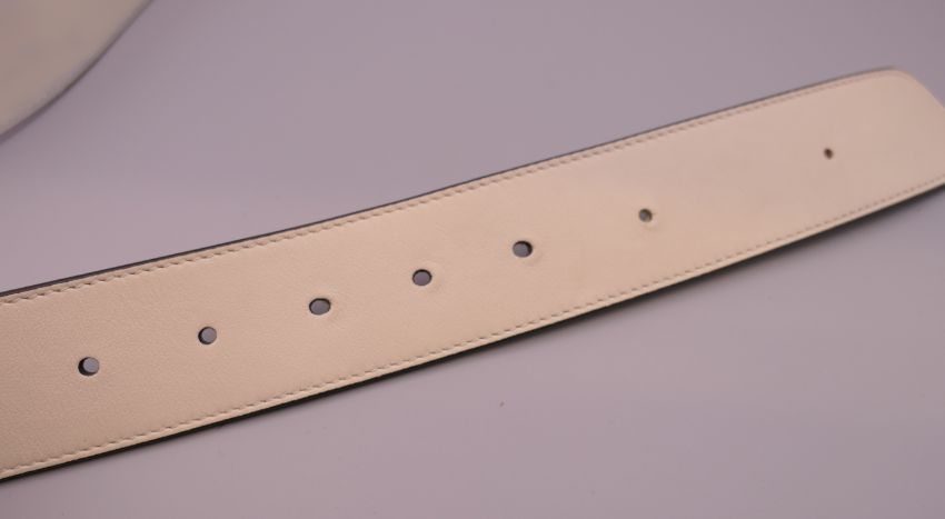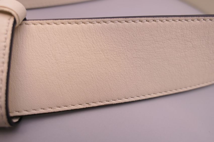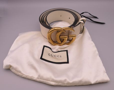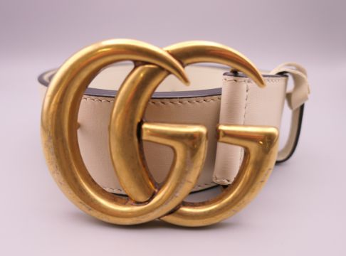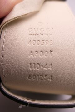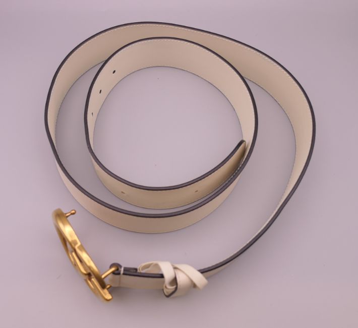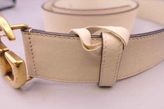 A Gucci cream leather belt in a Gucci fabric bag. Buckle 7.5 cm wide, belt 125 cm long excluding buckle.