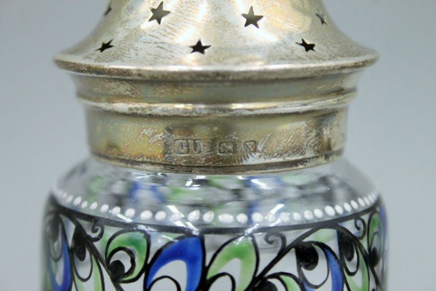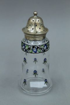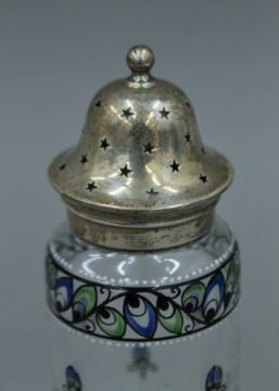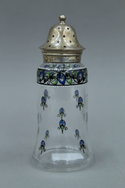 A silver hand painted sugar sifter, hallmarked for 1947. 17 cm high.